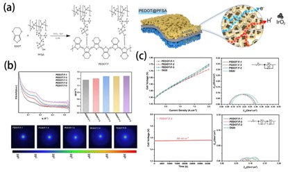 Compared to the commercial Nafion perfluorosulfonic acid (PFSA), the PEDOT:F ionomers exhibit superior oxygen evolution reaction (OER) performance as catalyst binders. According to Tang, both experimental data and Density Functional Theory (DFT) findings validate that the utilization of PEDOT enhances catalytic activity by increasing conductivity and reducing the energy barrier.