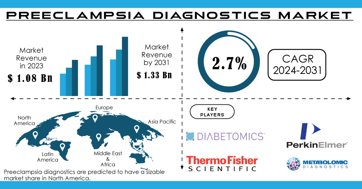 AUSTIN, TEXAS, UNITED STATES, June 24, 2024 /EINPresswire.com/ -- The Global Preeclampsia Diagnostics Market Size was valued at USD 1.08 billion in 2023 and is projected to reach USD 1.33 billion by 2031, growing at a compound annual growth rate (CAGR) of 2.7% during the forecast period from 2024 to 2031. The steady growth of the market is driven by advancements in diagnostic technologies, increasing awareness about maternal health, and rising incidences of preeclampsia globally.Preeclampsia is a pregnancy complication characterized by high blood pressure and signs of damage to other organs, most often occurring after 20 weeks of pregnancy. Early detection and management of preeclampsia are crucial to reducing maternal and fetal morbidity and mortality rates. Diagnostic tests for preeclampsia include blood tests, urine analysis, blood pressure monitoring, and ultrasound examinations, aimed at assessing maternal and fetal health during pregnancy.
