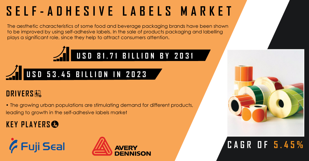AUSTIN, TEXAS, USA, June 24, 2024 /EINPresswire.com/ -- The Self-Adhesive Labels Industry valued at USD 53.45 billion in 2023 according to the SNS Insider report, is expected to reach USD 81.71 billion by 2031, reflecting a projected CAGR of 5.45%.Self-adhesive labels are sticking around. This market is growing fast, fueled by the booming food and beverage industry and the growing popularity of packaged goods in cities around the world. People are moving to cities, and that means they're buying more pre-packaged stuff. This is reflected in sales figures, with a jump of 4.39% in stores selling food and everyday items in the US just between January 2022 and 2023.