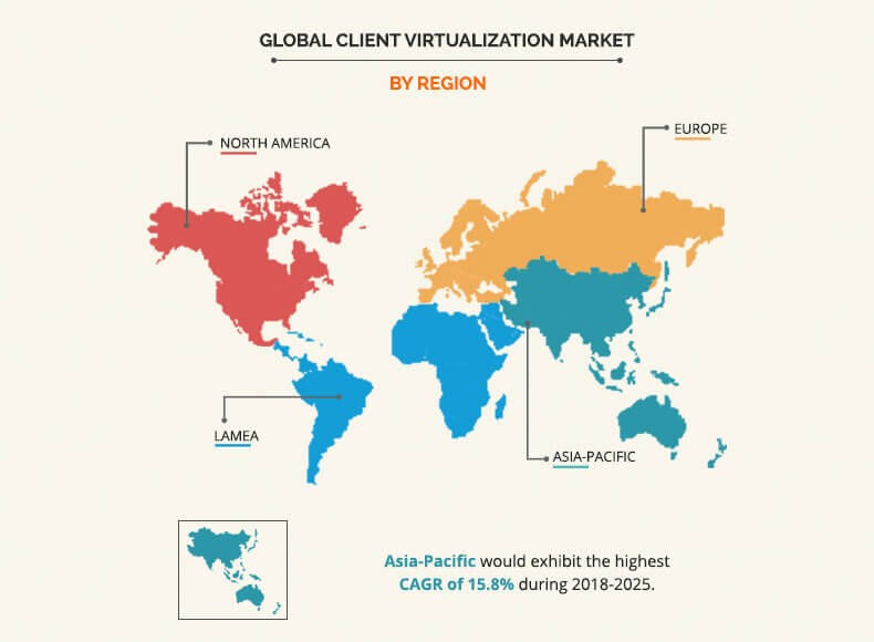 By Region, The global client virtualization market was dominated by North America and is expected to maintain this trend during the forecast period. However, the Asia-Pacific segment is expected to witness the highest growth, owing to rise in BYOD solutions and need for better desktop management among organizations in developing countries.