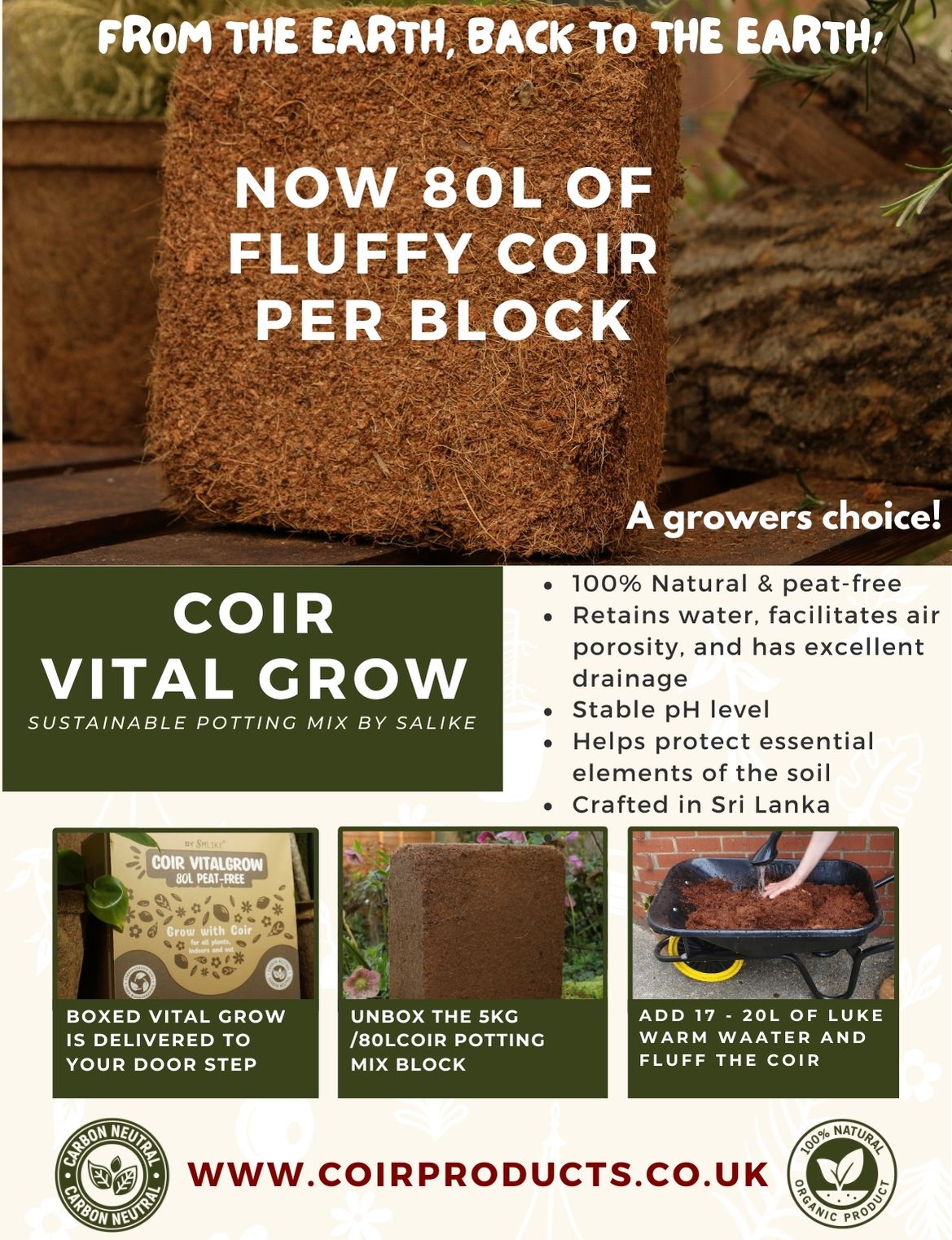LONDON, UNITED KINGDOM, June 25, 2024 /EINPresswire.com/ -- In a groundbreaking move, UK’s largest coir portfolio, Salike® proudly offers its signature coir potting mixes in new, value-packed 80L packages. This strategic expansion underscores Salike's dedication to innovation and customer satisfaction in the rapidly evolving horticultural industry.Salike’s new Coir Vital Grow and Coir Plus products now deliver an impressive 80L of premium coir when hydrated, offering customers unparalleled value. Previously only available in 70L to 75L, the newly introduced range is ethically produced and sourced, meeting our stringent environmental and social commitments. Blending its innovative spirit with an unwavering commitment to providing customer-centric solutions, Salike® continues to lead the way in sustainable gardening.