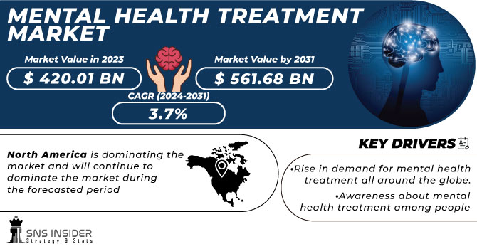 AUSTIN, TEXAS, UNITED STATES, June 25, 2024 /EINPresswire.com/ -- The SNS Insider report estimates the Mental Health Treatment Market Size at USD 420.01 billion in 2023, with a projected CAGR of 3.7% to reach USD 561.68 billion by 2031.The mental health treatment market is growing due to several factors such as the reduction in the stigma surrounding mental illness, rise in cases of mental health and aging population. For Instance, According to Who more than 1 billion people are suffering from mental health disorder.