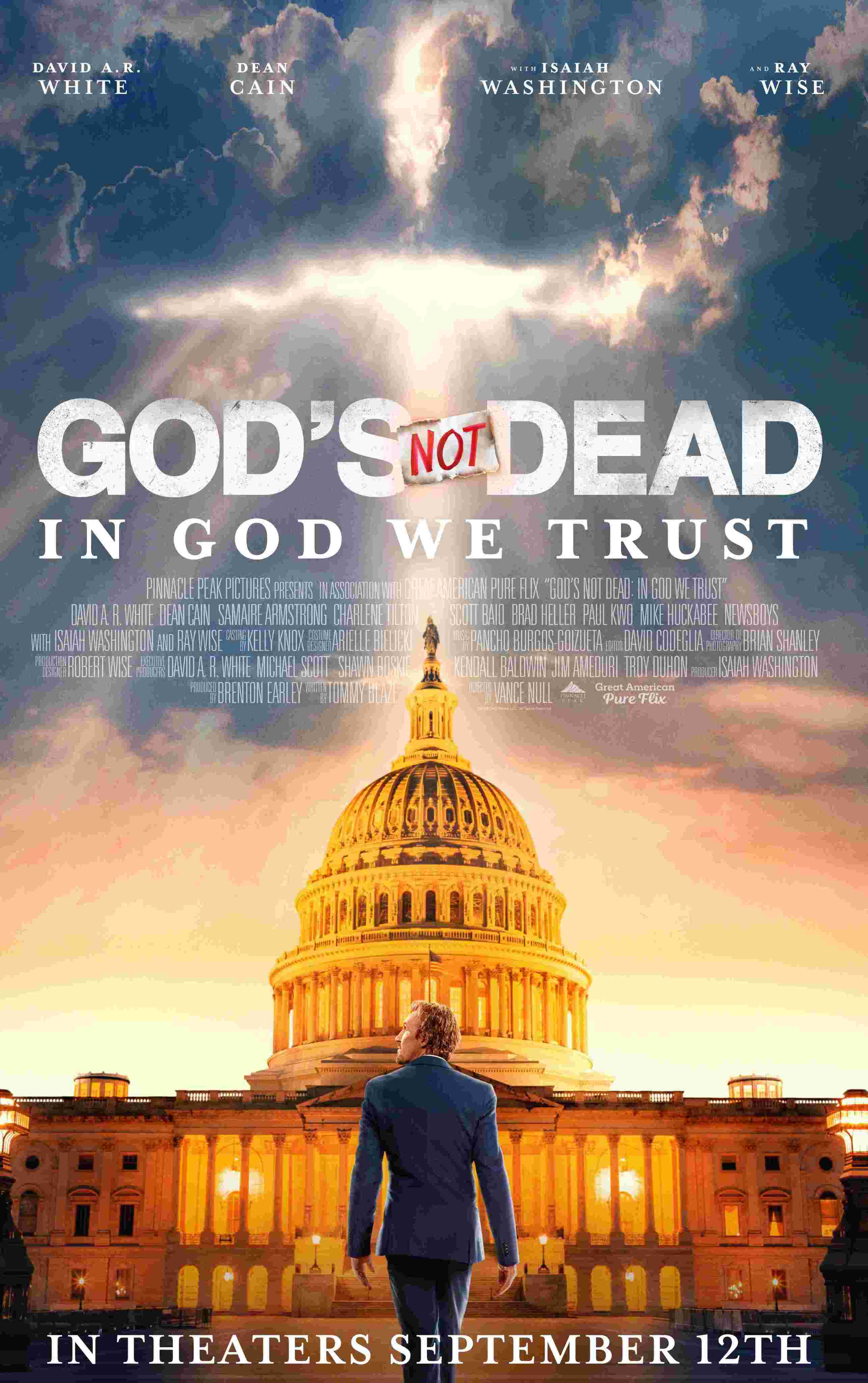 NASHVILLE, TN, UNITED STATES, June 25, 2024 /EINPresswire.com/ -- Pinnacle Peak Pictures in association with Great American Pure Flix, is excited to announce the exclusive cinema premiere of God’s Not Dead: In God We Trust on September 12, 2024. The highly anticipated film, featuring a stellar cast and notable guest appearances, delves into the complex relationship between faith, politics, and our civic responsibilities, and will be distributed to theaters nationwide through Fathom. God’s Not Dead: In God We Trust is a politically riveting fight for freedom starring Isaiah Washington (Grey’s Anatomy), David A. R. White (GOD’S NOT DEAD, Evening Shade), Dean Cain (Lois & Clark), Samaire Armstrong, (The O.C.), Ray Wise (ROBO COP), Scott Baio (Happy Days), Charlene Tilton (Dallas), with guest appearances by Governor Mike Huckabee, Raymond Arroyo (EWTN’s The World Over with Raymond Arroyo), and Grammy Award -Winning band Newsboys.