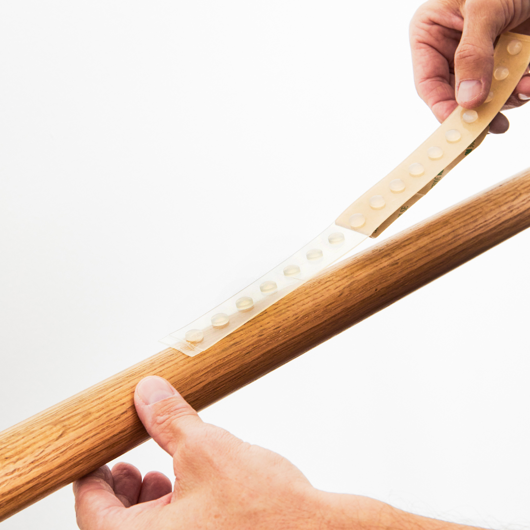 The semi-spherical bumps on RST are designed to allow clothes to be rotated 180 degrees and moved side to side without hangers slipping out of place. The height of the bumps keeps hangers secure, while the tape's width ensures a firm grip on the closet rod and hanger top. Leaving hangers in place after removing items maintains an orderly appearance and provides clear storage spots, ensuring users always know where to return items.