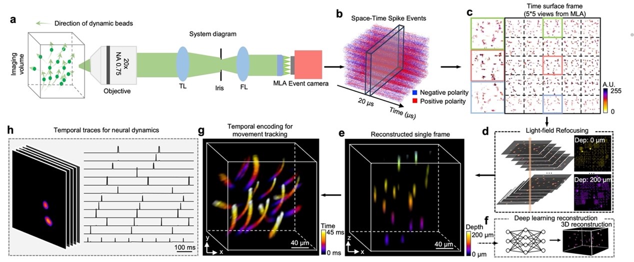 In a new paper (https://doi.org/10.1038/s41377-024-01502-5) published in Light Science & Applications, a team led by Professor Lei Tian from the Department of Electrical and Computer Engineering at Boston University, and co-workers have developed an EventLFM, a novel ultrafast, single-shot 3D imaging technique that integrates an event camera into a Fourier LFM system to facilitate volumetric imaging at kHz speeds. The team demonstrated EventLFM's capability to reconstruct complex dynamics of rapidly moving 3D objects at 1 kHz temporal resolution. Through controlled illumination experiments, they showcased its ability to image high-frequency 3D blinking objects with pulse widths as short as 1 ms. Additionally, the technique effectively captures rapid dynamic signals within scattering tissues, as evidenced by imaging realistic neuronal activities in a mouse brain section simulated by a series of DMD patterns to induce unique spatiotemporal footprints at kHz rates. The team also presented successful imaging and tracking of GFP-expressing neurons in freely moving C. elegans within a 3D space, achieving a frame rate of 500 Hz. Additionally, the integration of a deep learning reconstruction network with EventLFM has significantly improved imaging quality and enhanced 3D resolution.