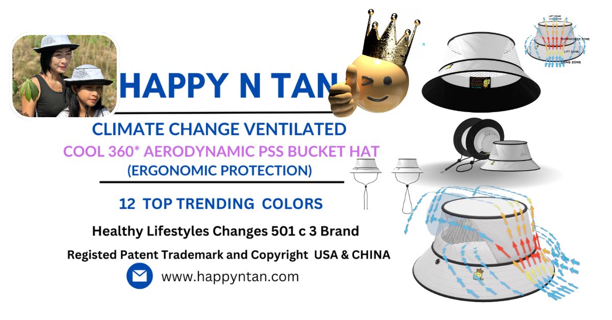 Stay tuned this article is sponsored by the top 12 trending “Happy n Tan Climate Change Ventilated V-Shape Front Panel Cool 360* Aerodynamic (Ergonomic Protection) PSS Bucket Hats”. The brand of Healthy Lifestyle Changes, inc. 501 © 3 initiatives. This product is not available on Amazon. Shop www.HappynTan.com