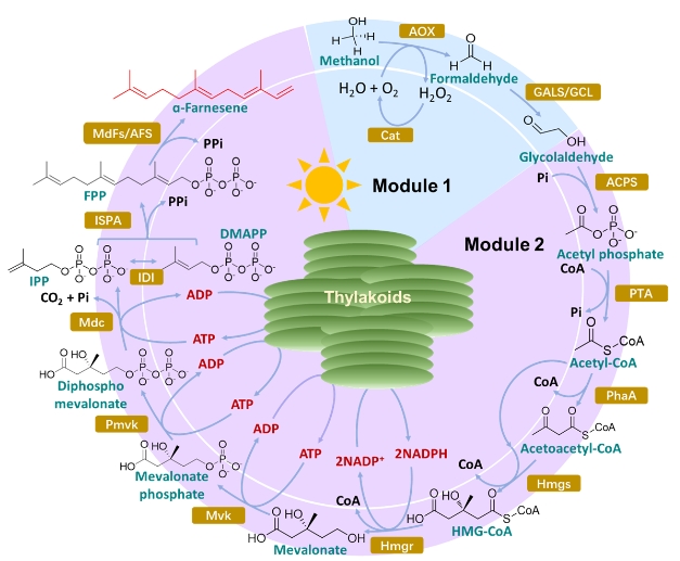 The new process involves a series of 13 enzyme-driven reactions divided into two modules integrated with thylakoid membranes as a light-powered engine to convert methanol into α-farnesene. These membranes help to regenerate adenosine triphosphate and nicotinamide adenine dinucleotide phosphate hydrogen, which are energy molecules needed for enzymatic reactions. The use of light not only makes the process more sustainable but also more efficient.
