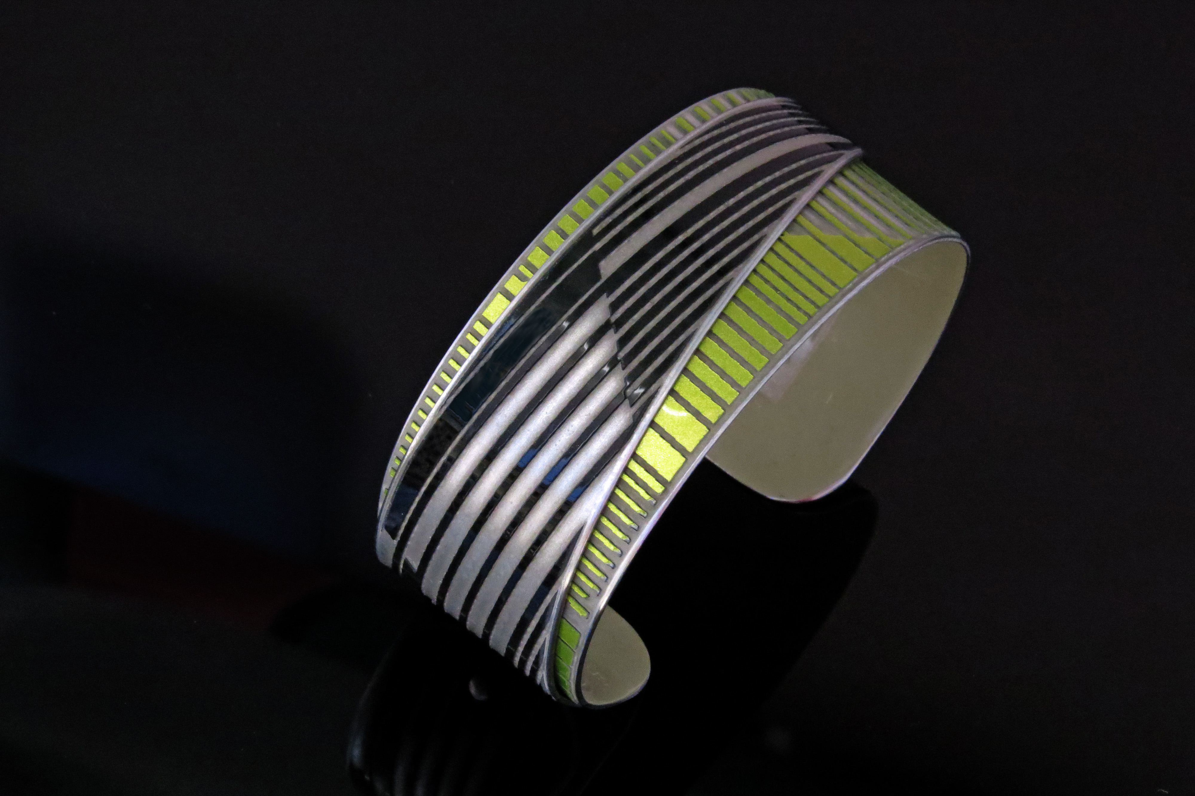 Using emerging laser technology, CRASH Jewelry's innovative designs are created through a process that selectively preserves and highlights the Cadillac's original factory paint. The Blackwing Icon Cuff depicts the repeating logo pattern that, at first glance, resembles a tire tread.