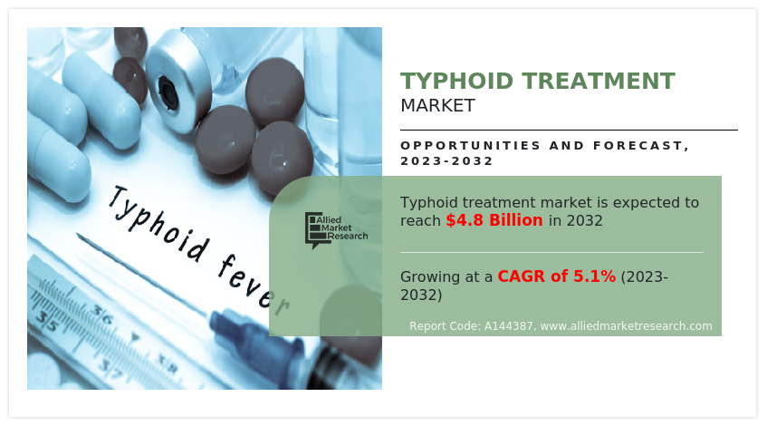 WILMINGTON, DELAWARE, UNITED STATES, July 9, 2024 /EINPresswire.com/ -- “Typhoid Treatment Market by Treatment Type (Antibiotics, Pain Medication, Others), by Route of Administration (Oral, Intravenous), by Distribution Channel (Hospital Pharmacies, Drug stores and retail pharmacies, Online providers): Global Opportunity Analysis and Industry Forecast, 2023–2032”. According to the report, the global typhoid treatment market valued for $2.9 billion in 2022 and is estimated to reach $4.8 billion by 2032, exhibiting a CAGR of 5.1% from 2023 to 2032.