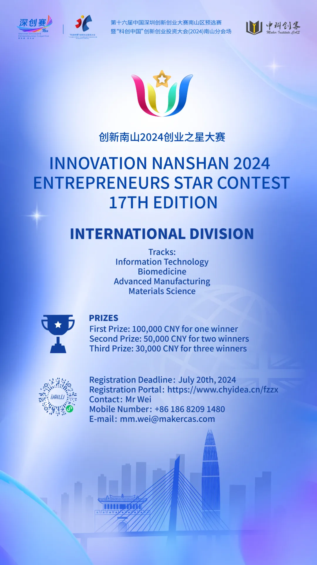 The Innovation Nanshan Entrepreneurs Star Contest is guided by the Shenzhen Municipal People's Government, organised by the Shenzhen Nanshan District People's Government and the Shenzhen Science and Technology Innovation Commission, hosted by the Shenzhen Nanshan District Science and Technology Innovation Bureau and executed by the Shenzhen Nanshan District Innovation Development Promotion Centre. It is an international entrepreneurship competition in science and technology.