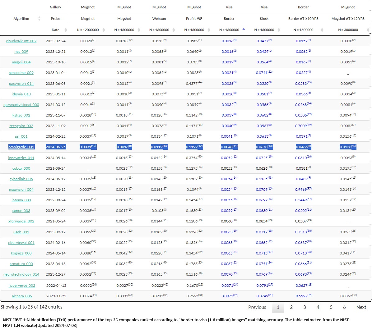 Omnigarde new AI Software achieved top-1 and 2 positions among US-based companies and top-8 and 11 positions worldwide in NIST FRVT 1:N tests