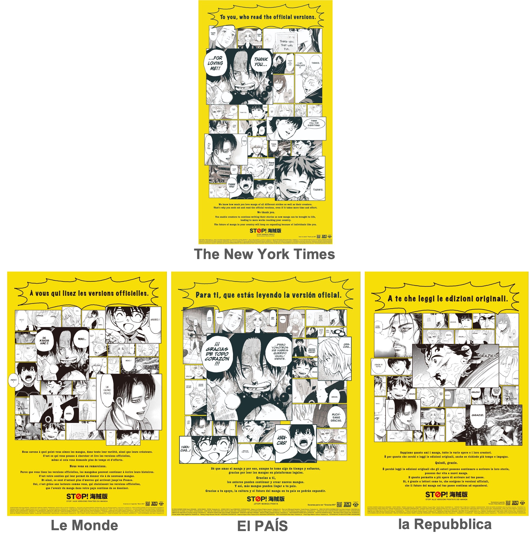 The New York Times will feature an advertisement expressing gratitude to readers who choose official versions over pirated ones. Similar ads will appear in major newspapers across the other countries: la Repubblica in Italy, EL PAÍS in Spain, and Le Monde in France. This unique, positive approach of saying "Thank you for reading official versions" instead of "Stop reading pirated versions" has already proven successful in Japan. It sparked discussions about piracy on social media, making the issue visible and fostering an atmosphere that encourages reading official versions. As a result of this initiative, the amount of free reading , which was previously 500 billion yen, was reduced by 25%, bringing it down to 380 billion yen.