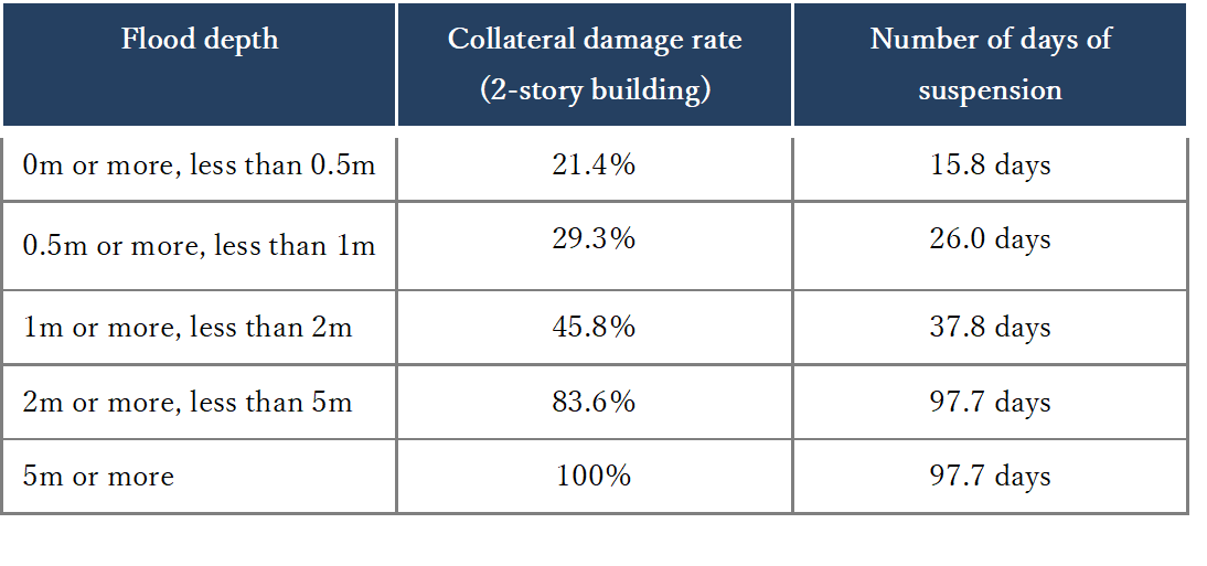 To quantify physical risk, information on flood depth by region and information on damage rate/number of business days off by flood depth are required. Information on flood depth by region is published by the Ministry of the Environment in Japan. Information on damage rate/number of business days off by flood depth is published by the Ministry of Land, Infrastructure, Transport and Tourism in Japan (Figure Ⅰ).