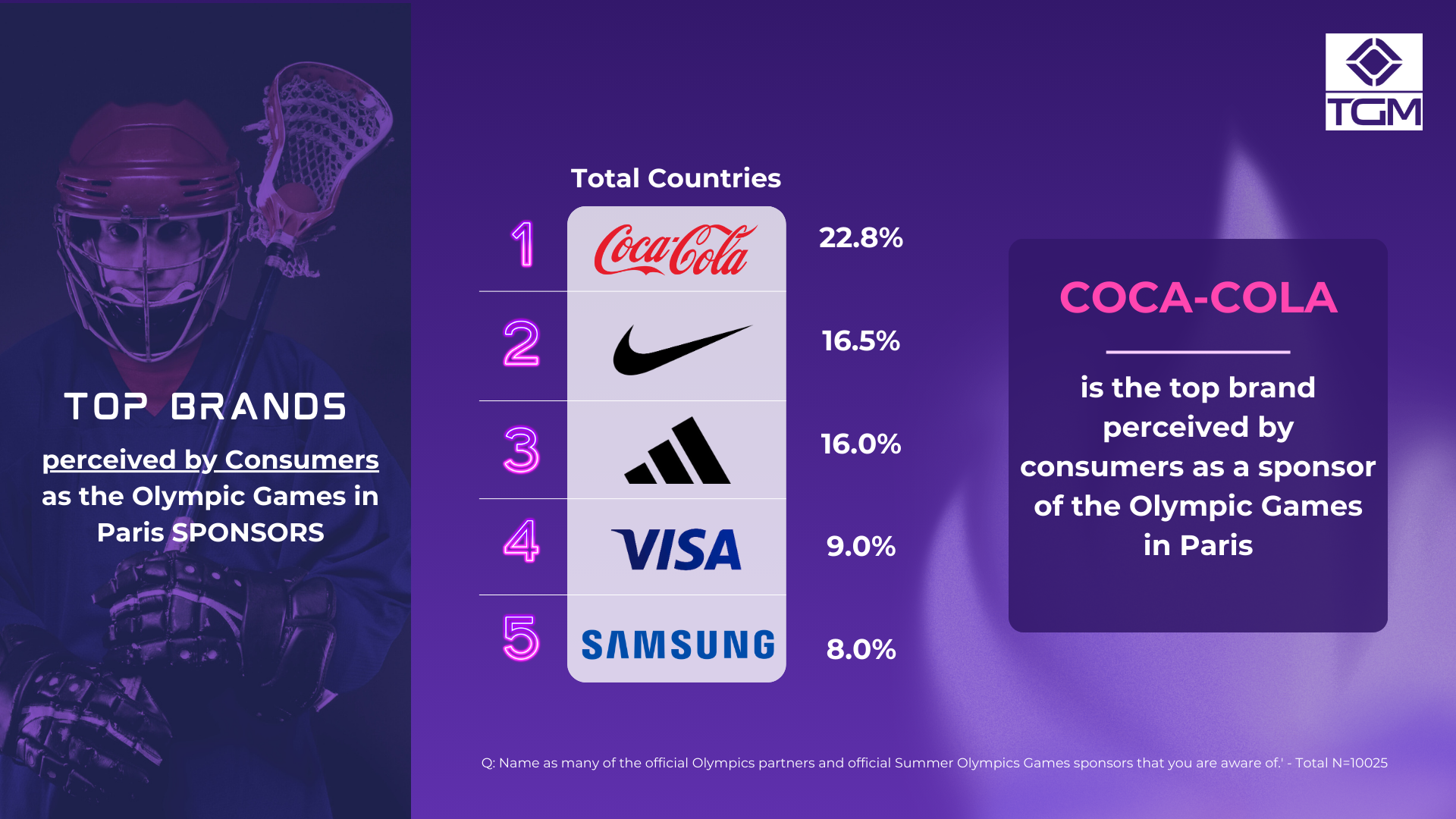 • La perception du parrainage : lorsqu'on leur a demandé de citer les sponsors du tournoi, les consommateurs ont le plus souvent identifié Coca-Cola comme sponsor des Jeux olympiques, avec un taux de reconnaissance de 22,8 %. Nike, bien que n'étant pas un sponsor officiel, suit de près avec 16,5 %, ce qui illustre la forte présence de sa marque. Adidas arrive en troisième position avec 16 %, les sponsors officiels comme Visa (9 %), Samsung (8 %) et Toyota (6,4 %) bénéficiant également d'une reconnaissance notable.