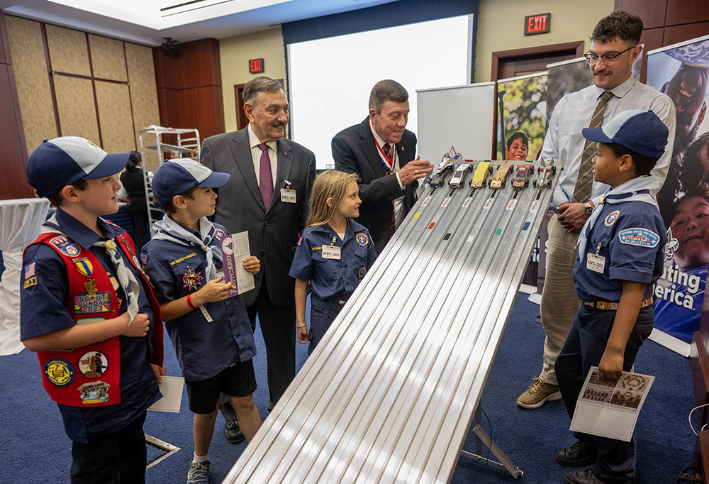Washington officials were joined by Scouting America youth in the Cub Scout and Scouts BSA programs, as well as members of the Venturing, Exploring and Sea Scout programs. Bringing real excitement and competition to the meeting, Cub Scouts from Pack 98 of National Capitol Area Council provided a Pinewood Derby track and cars for officials to race. Special guest NASA astronaut and Distinguished Eagle Scout Award recipient Mike Fossum immediately picked-out the Space Shuttle Pinewood Derby car and challenged all Cubs Scouts to race.