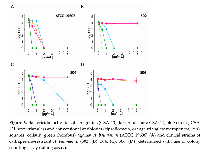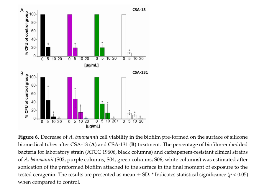 - Efficacy Against Biofilms: The study assessed ceragenins CSA-13, CSA-44, and CSA-131 on 65 clinical isolates of A. baumannii, revealing a strong bactericidal effect, even against biofilm-embedded cells.