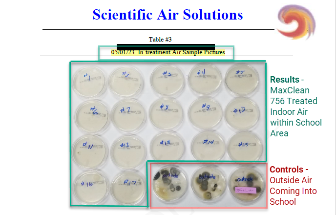 MaxClean 756 has developed a robust testing protocol with a 3rd party lab specializing in indoor air quality and microorganisms. This creates confidence for school decision makers. We have no interest in solving problems that do not exists. On-site 3rd party pre/post-testing builds trust based on empirical data.
