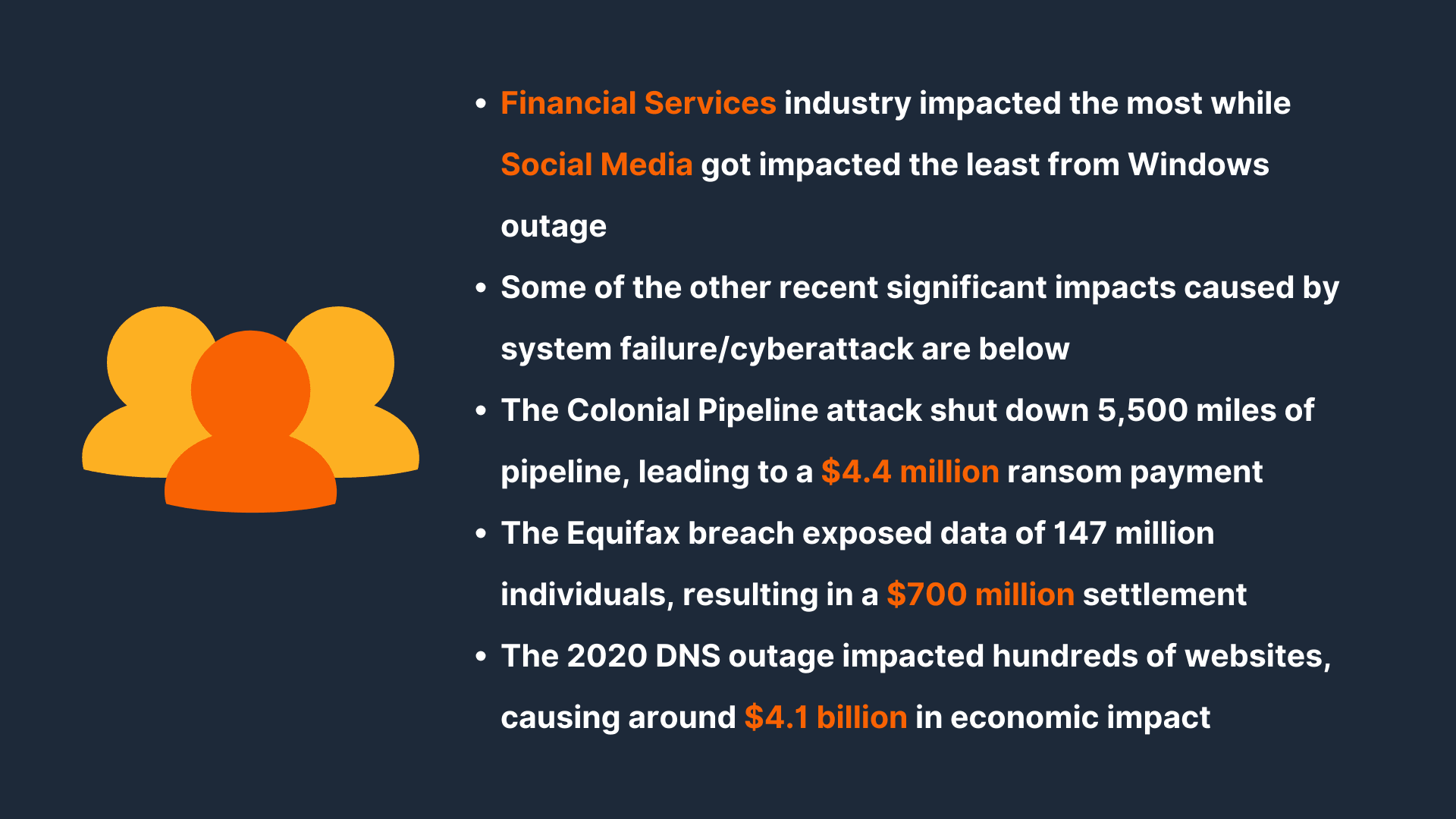 - Financial Services: Windows outage caused major disruptions, downtime in transactions, and financial losses.