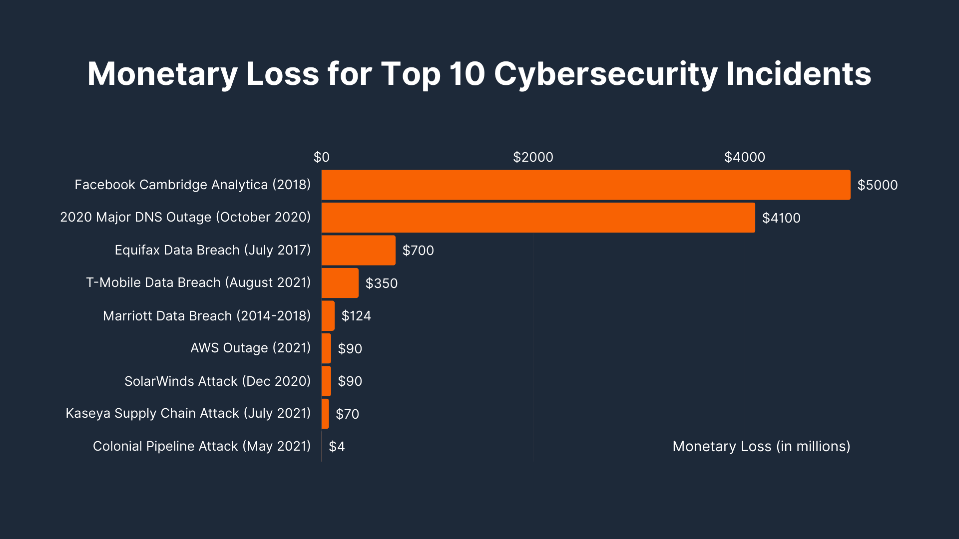 - Key System Failures (Past Five Years): Major incidents included the SolarWinds and Kaseya attacks, Colonial Pipeline attack, Equifax and Marriott breaches, Facebook scandal, DNS and AWS outages, T-Mobile breach, and British Airways outage.