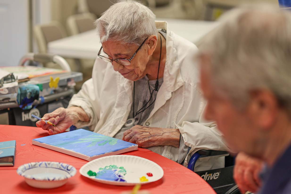 Lisa Wilkinson, admissions coordinator and social worker at Lakeview Commons, leads a painting class. “The feeling of putting paint on canvas and letting it flow is methodical and relaxing,” Lisa explains. “It’s not just about the end result; it’s about the process and the sense of calm and accomplishment it brings.”