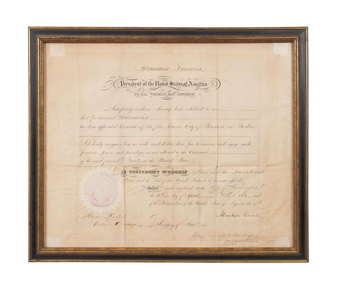 Most of the higher-dollar items came on July 17th. The consulate appointment, dated April 18, 1863, was signed by Lincoln using a dip pen. It also bore the signature of U.S. Secretary of State William Seward, and was accompanied by a JSA (James Spence Authentication). The document recognized Johannes Schumacher as the ‘consul for the Free Hanse of Bremen’, at the consulate office in Boston.