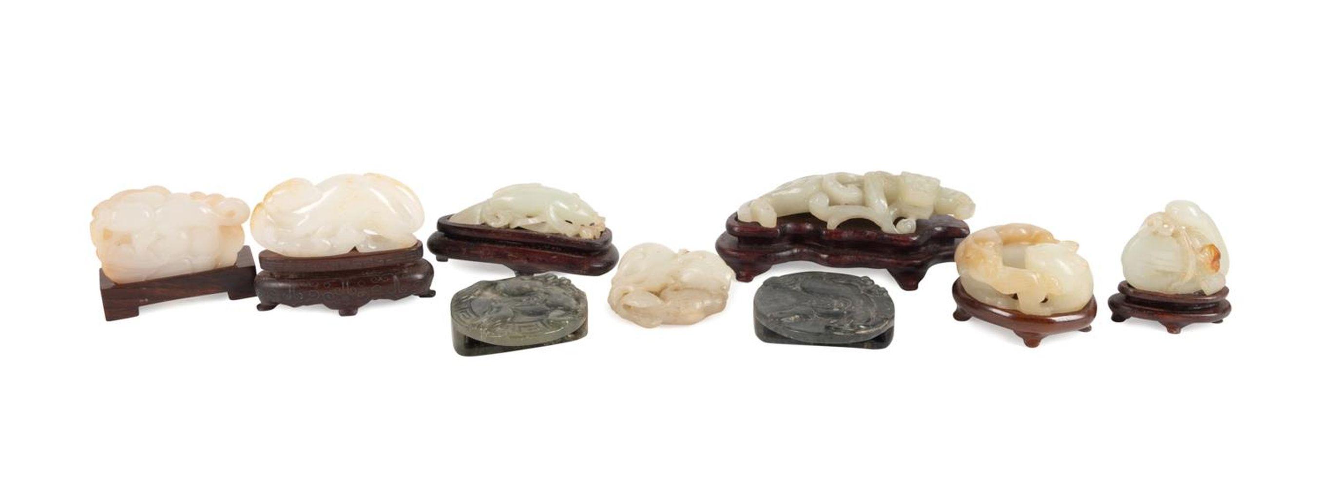 Group of nine pieces of carved jadeite and nephrite jade with six stands, showing various animal depictions, the jade ranging in color from cream to celadon to a dark green ($9,680).
