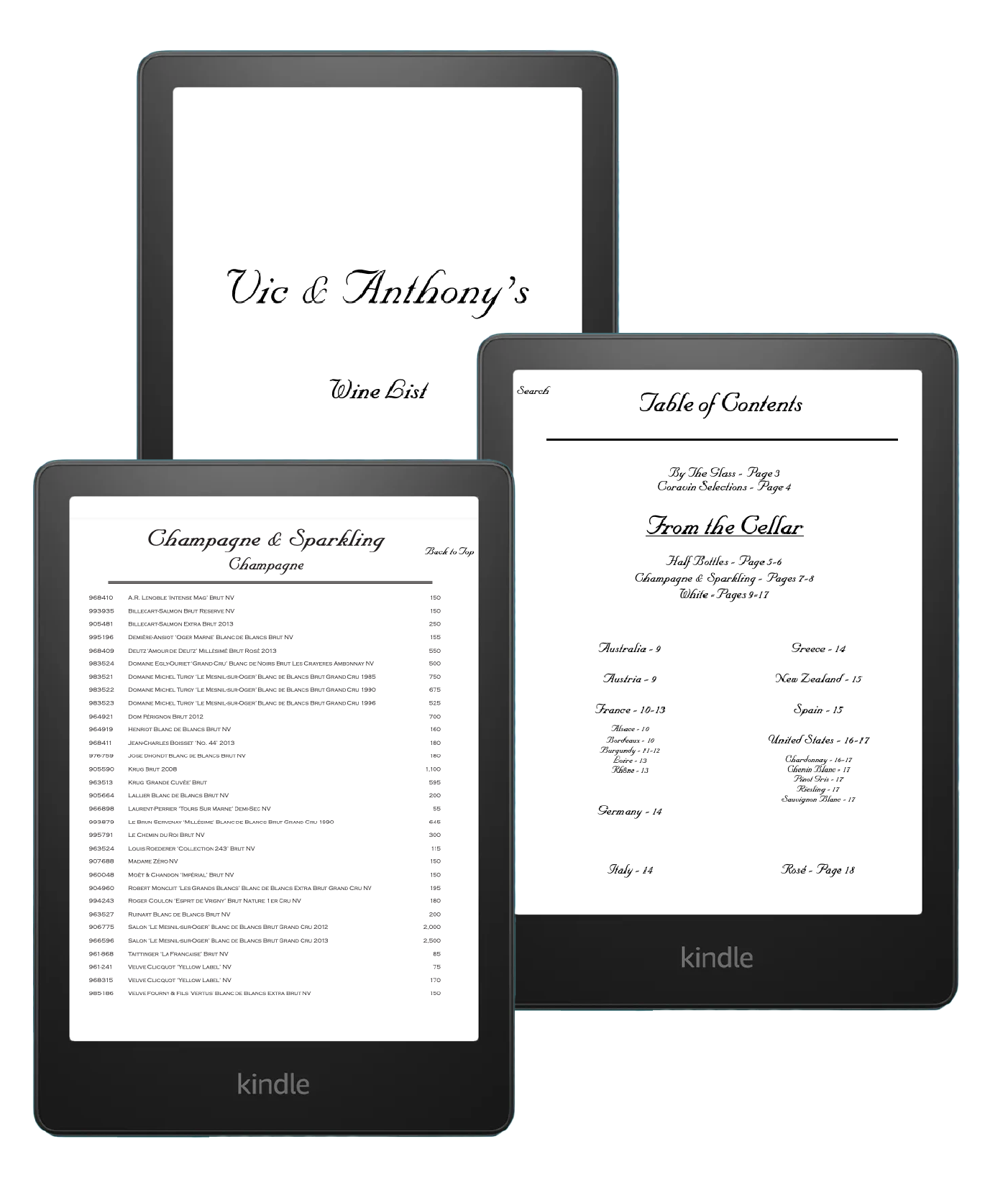 SommOne Classic replicates the exact appearance of a printed wine list with an interactive, hyperlinked table of contents, back button navigation and search on an eReader of the restaurant’s choice such as an Amazon Kindle Paperwhite. SommOne works with a variety of eReader Paperwhite brands and models such that any restaurant operator can choose the device that is best suited for its concept, ambiance and service.