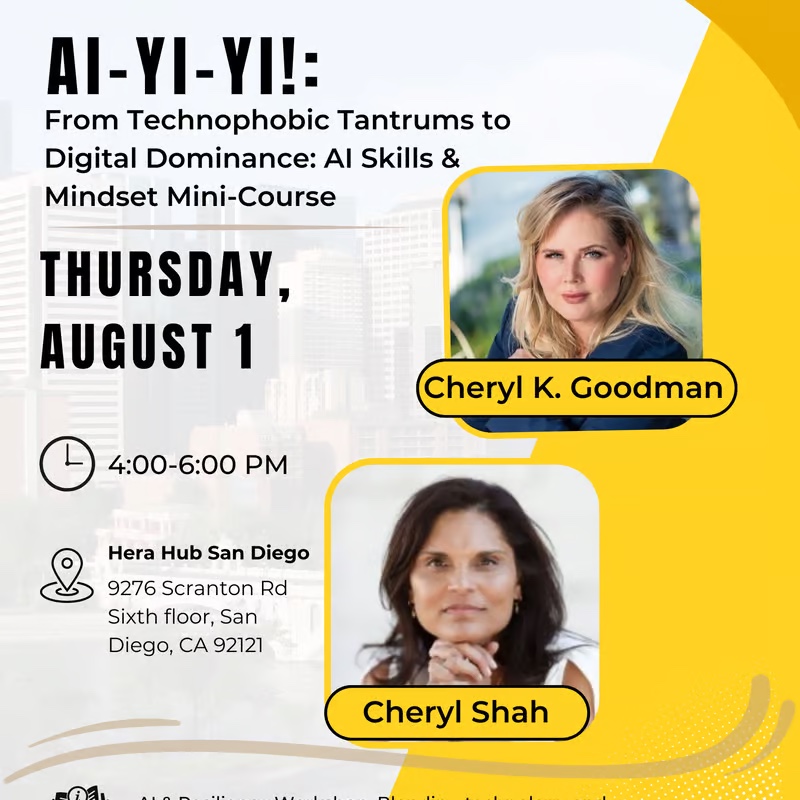LA JOLLA, CA, UNITED STATES, July 31, 2024 /EINPresswire.com/ -- In an era where artificial intelligence (AI) is rapidly transforming industries, the fear of being replaced by technology is a growing concern among employees. To address this anxiety and equip professionals with the necessary AI skills, Cheryl K. Goodman, an AI expert and best-selling author, and Cheryl Shah, a practicing mindfulness leader at UCSD, are hosting a transformative workshop titled "AI-yi-yi!: From Technophobic Tantrums to Digital Dominance: AI Skills & Mindset Mini-Course." Sign up here at https://lu.ma/o2exfhb0