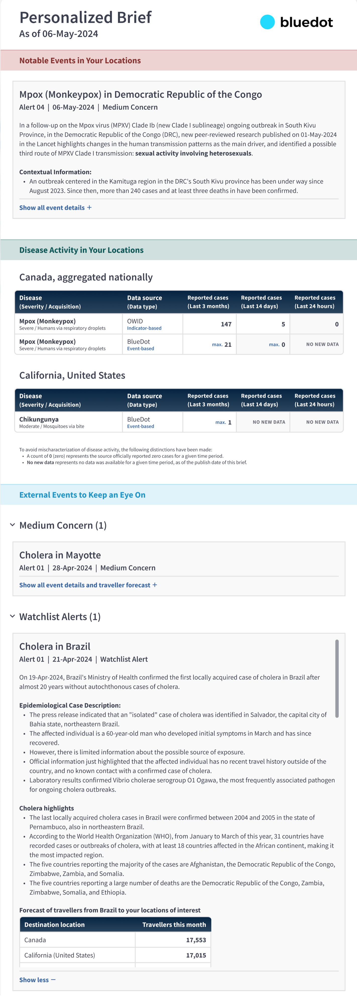 "BlueDot's Personalized Briefs save me valuable time each day. The structured format, featuring different activity timeframes [last 3 months, 7 days, and 24 hours], allows me to effortlessly compare outbreaks across countries and quickly identify which diseases require the most attention", stated Jieun Lee, Researcher, MSc, Infectious Disease Research Center, Korea Research Institute of Bioscience and Biotechnology.