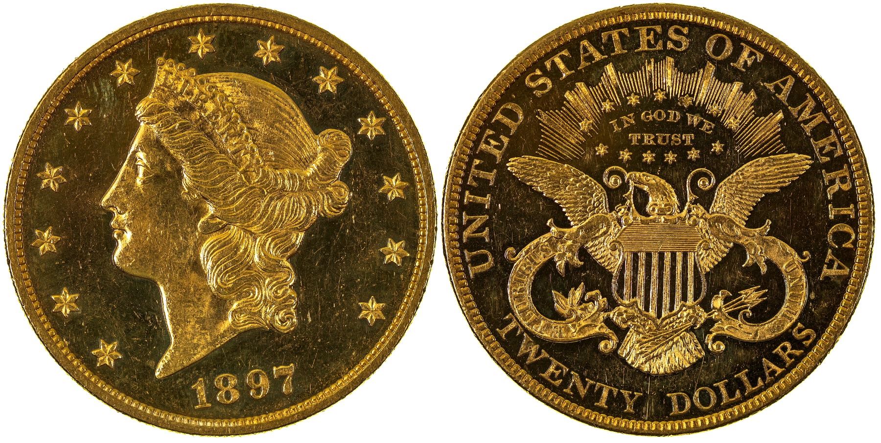 Proof example of the 1897 U.S. Liberty Head $20 gold coin, one of only 86 produced, out of which perhaps 35-50 are known (est. $30,000-$100,000).
