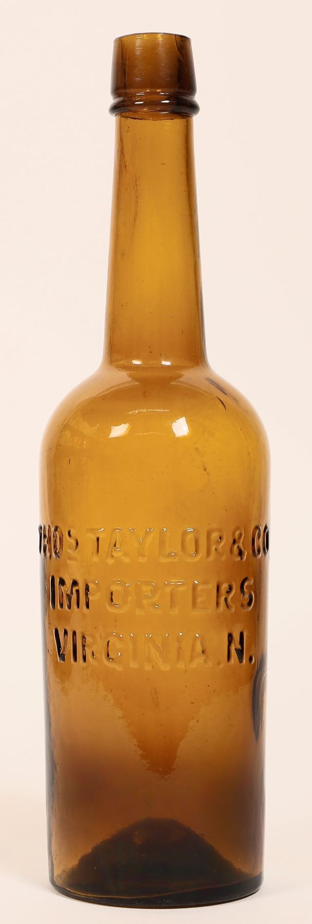 Rare and popular Western whiskey bottle, the Thos. Taylor (Virginia City, Nev.), produced circa the 1860s and, as an applied top whiskey bottle, the only one from Nevada (est. $8,000-$14,000).