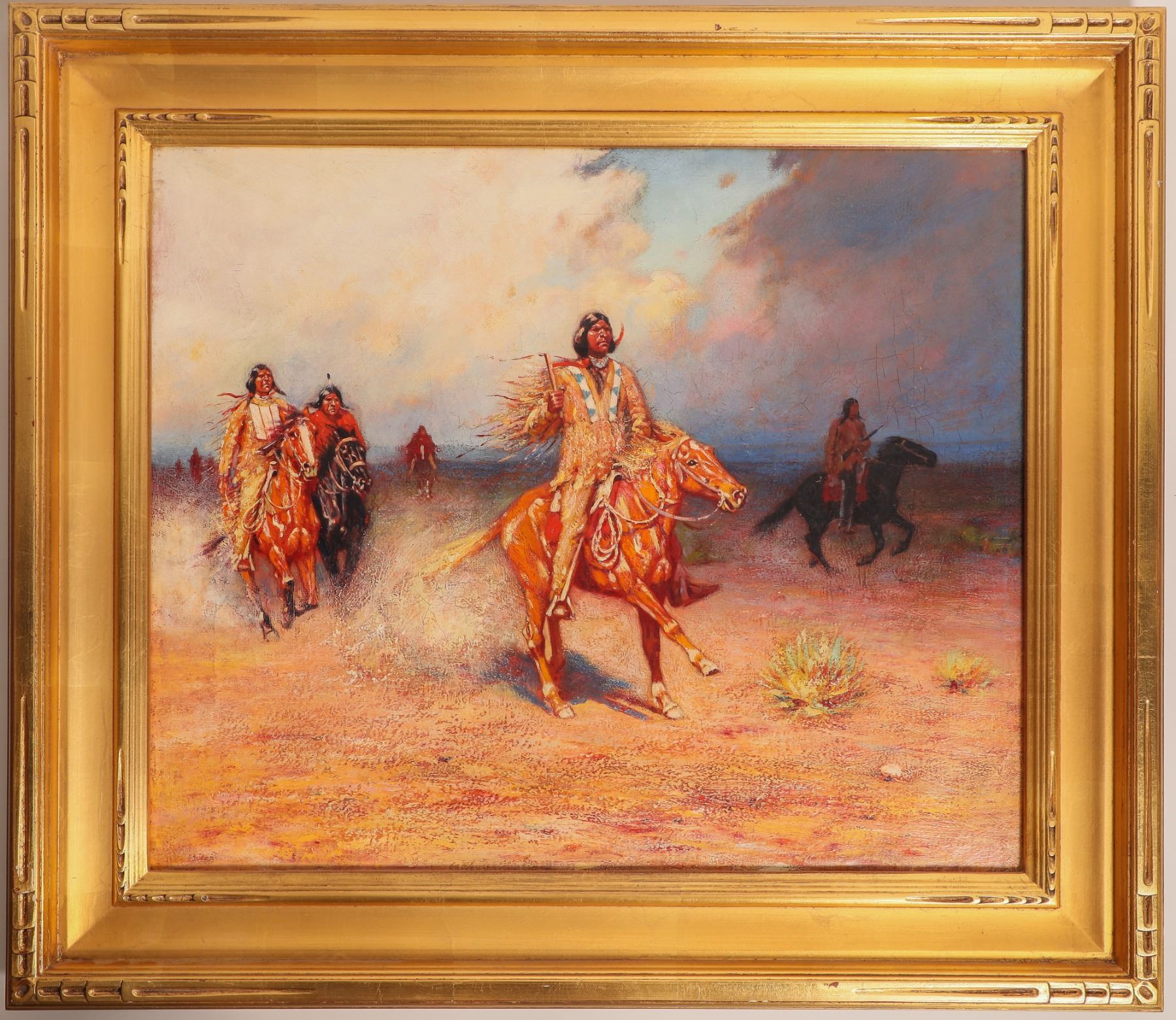 Stunning, detailed bright and vibrant depiction of Indians on the trail, possibly an unfinished painting by the renowned Western artist CM Russell, circa 1912-1914 (est. $100,000-$200,000).