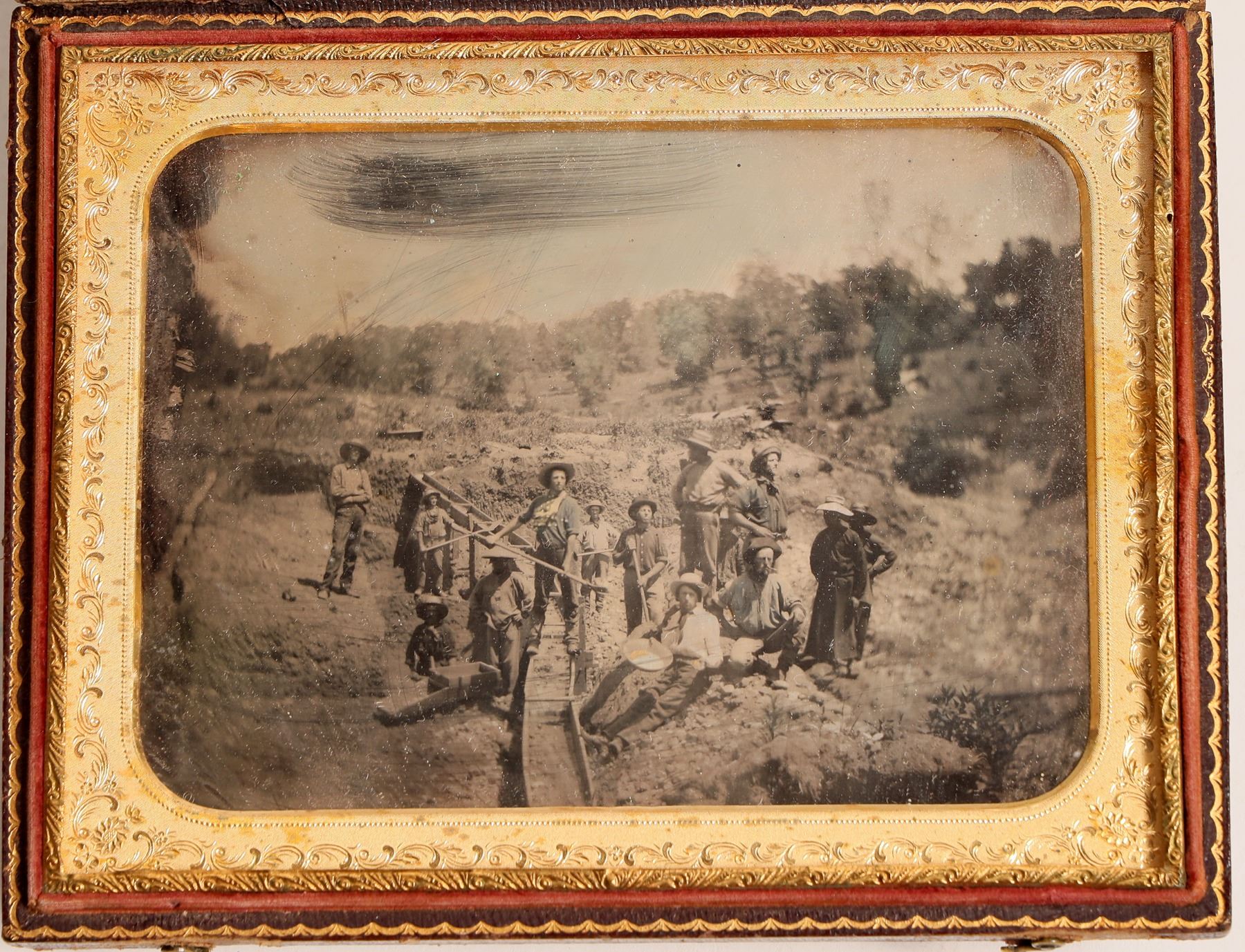 There are too many Western antiquities to mention, but one intriguing lot is the half-plate daguerreotype image of 13 gold miners working their gold claim in Hangtown, Calif. (later Placerville, earlier Dry Diggins) during the California Gold Rush. The 4 ½ inch by 5 ½ inch photo is extremely clear and comes in a leather photo case. It should bring $10,000-$15,000.