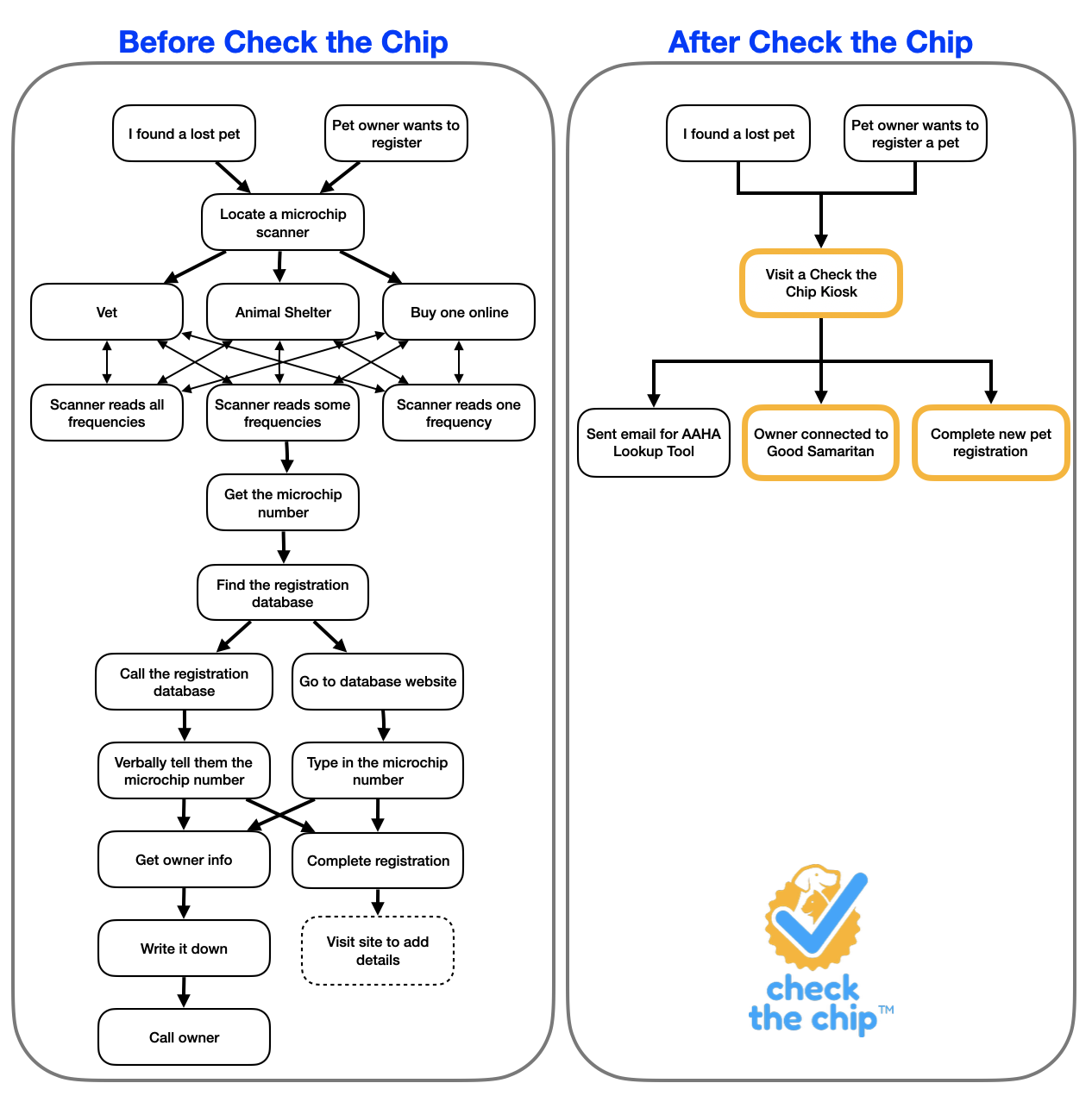 This confusion among pet owners is the problem being solved by Check the Chip, Inc., a PetTech startup with the first-ever pet microchip scanning kiosk in pet stores and are on a mission to fix the pet microchip problem by educate pet owners and communities about the steps necessary to return lost pets home safely.