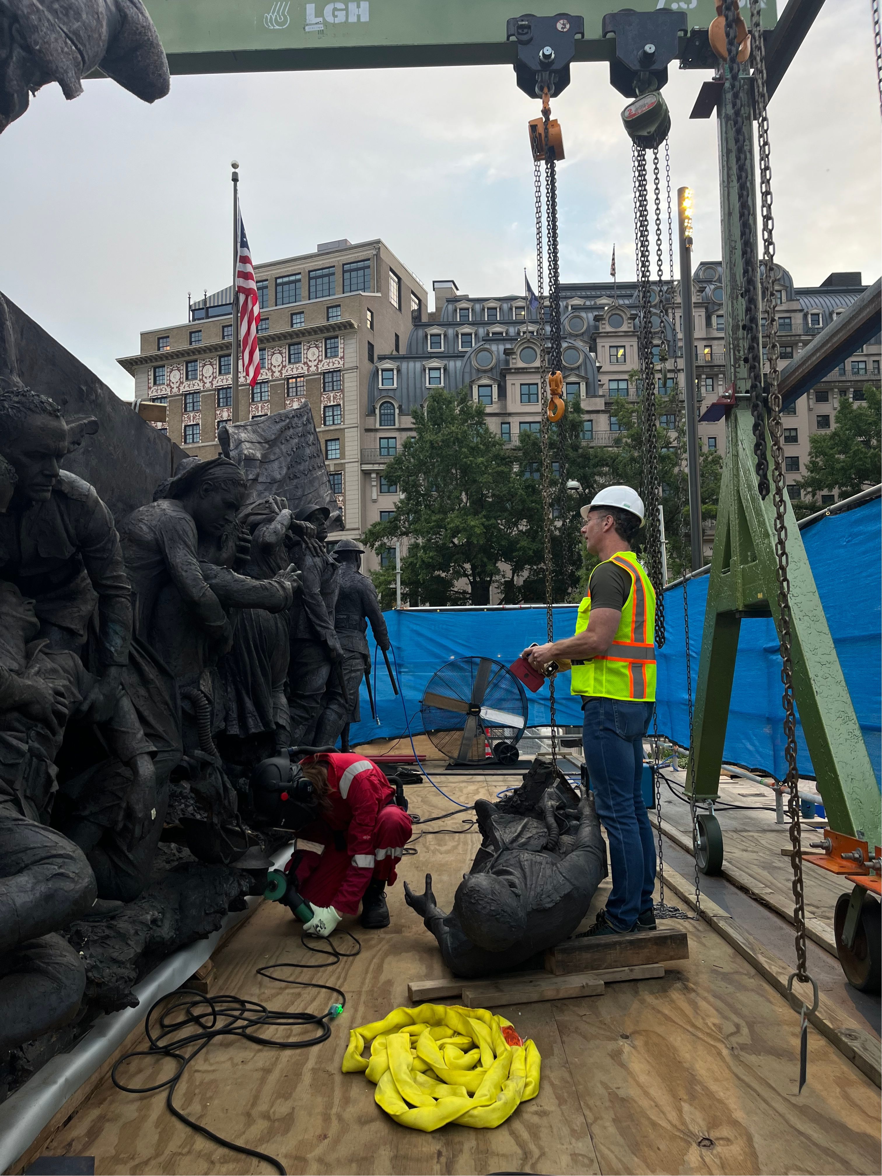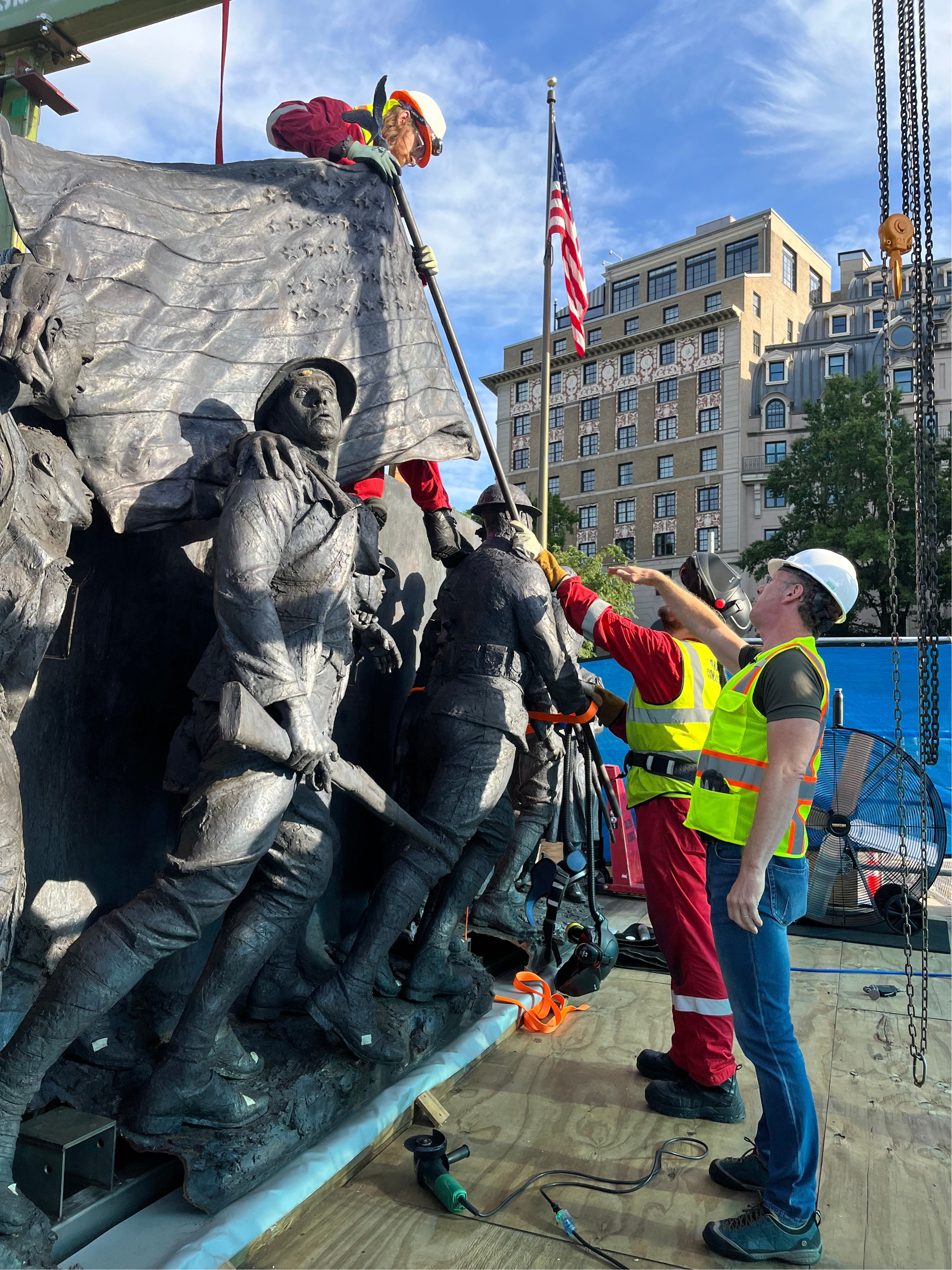 Widely known as America’s Michelangelo, Howard surveys his handiwork as Grunley Construction of Baltimore and Pangolin-Editions Foundry of Stroud, UK work together to fit the bronze figures into place against the backdrop of the 60’ long, 10’ high bronze relief wall. Pennsylvania Avenue was shut down at dawn some 10 days ago and cranes rolled in to hoist sections of the 25 ton sculpture into place. Welders from Pangolin work to secure the figures.
