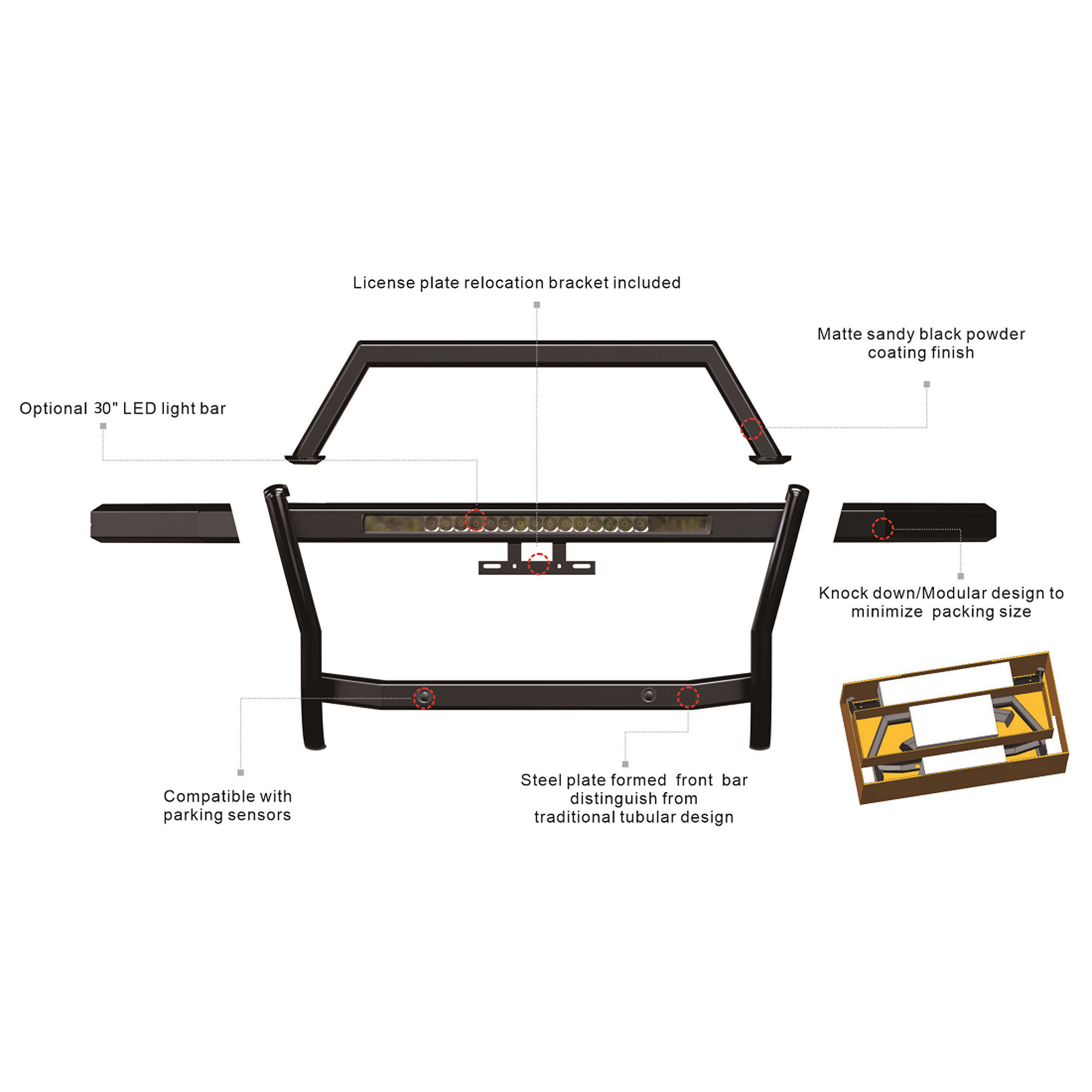 Constructed from robust 4-gauge steel to provide exceptional strength for off-road and everyday use – particularly against unexpected driving pitfalls – the new grille guards are exceptionally strong, reliable and stylish. Their durable matte sandy black powder coating finish defends against rust and corrosion, and their modular design affords easy access to vehicle headlight wings and hood, without having to dismantle the top and other side, for cleaning, troubleshooting and maintenance.