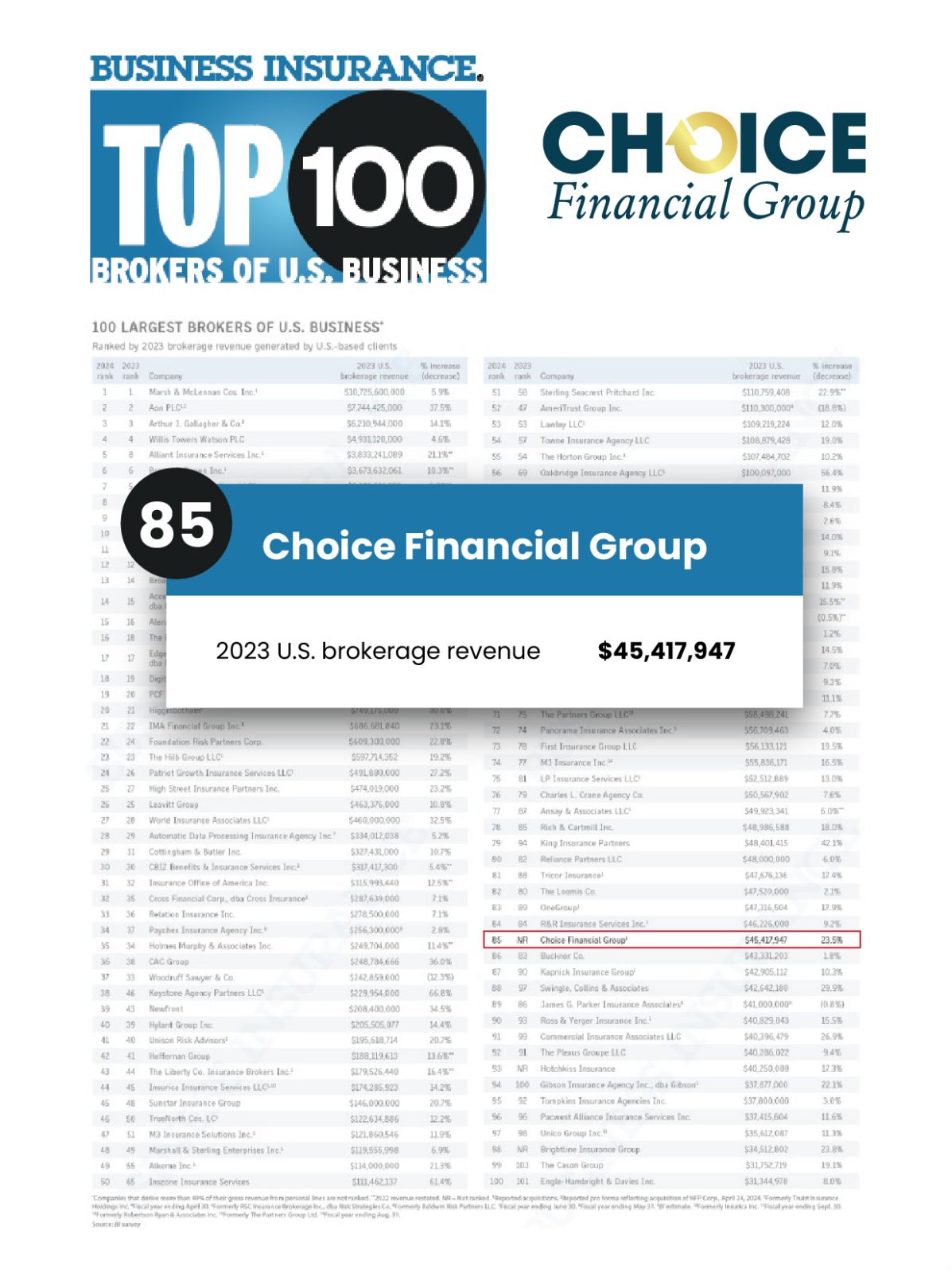 Choice Financial Group proudly announces its inclusion in the Business Insurance Top 100 Brokers list for 2024.