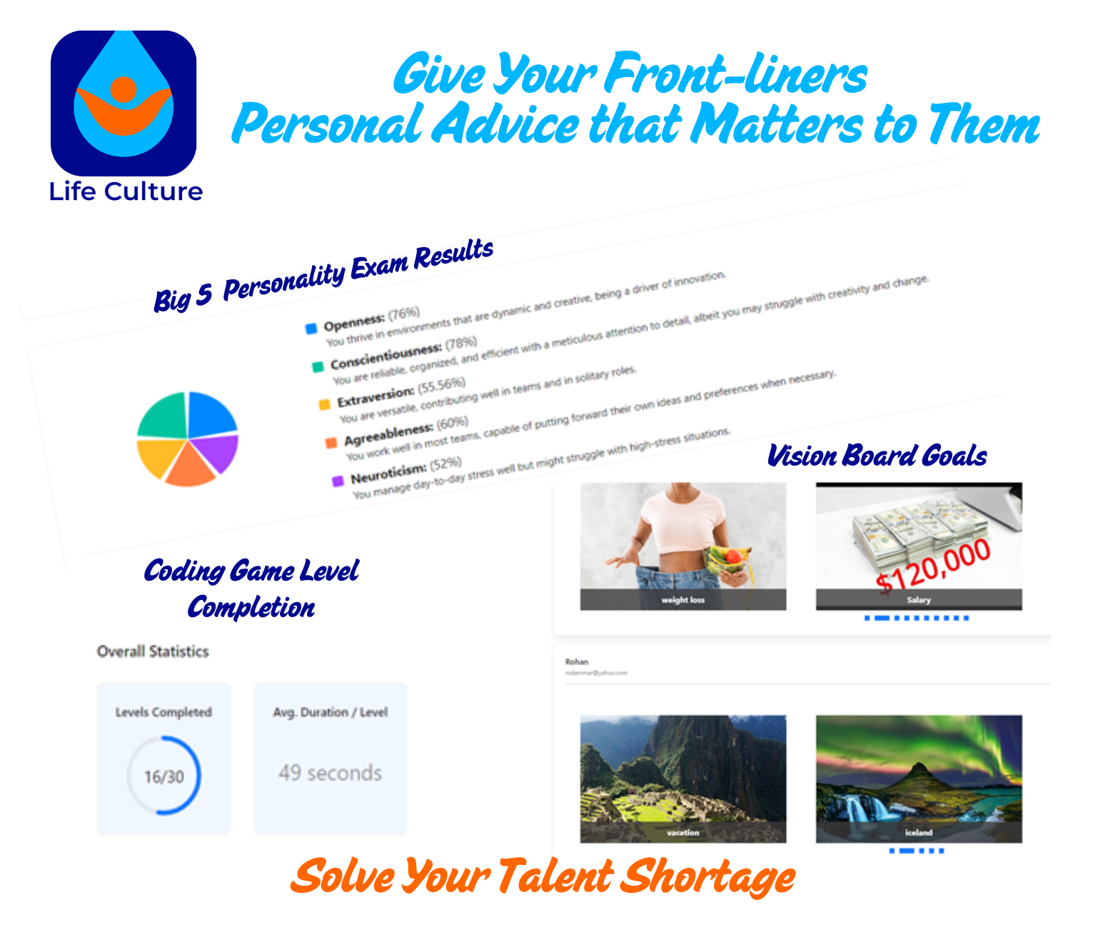 Front-liners want career development. The Life Culture Audit app with Big 5 Personality Exam sets the stage for self-discovery leading to career development.