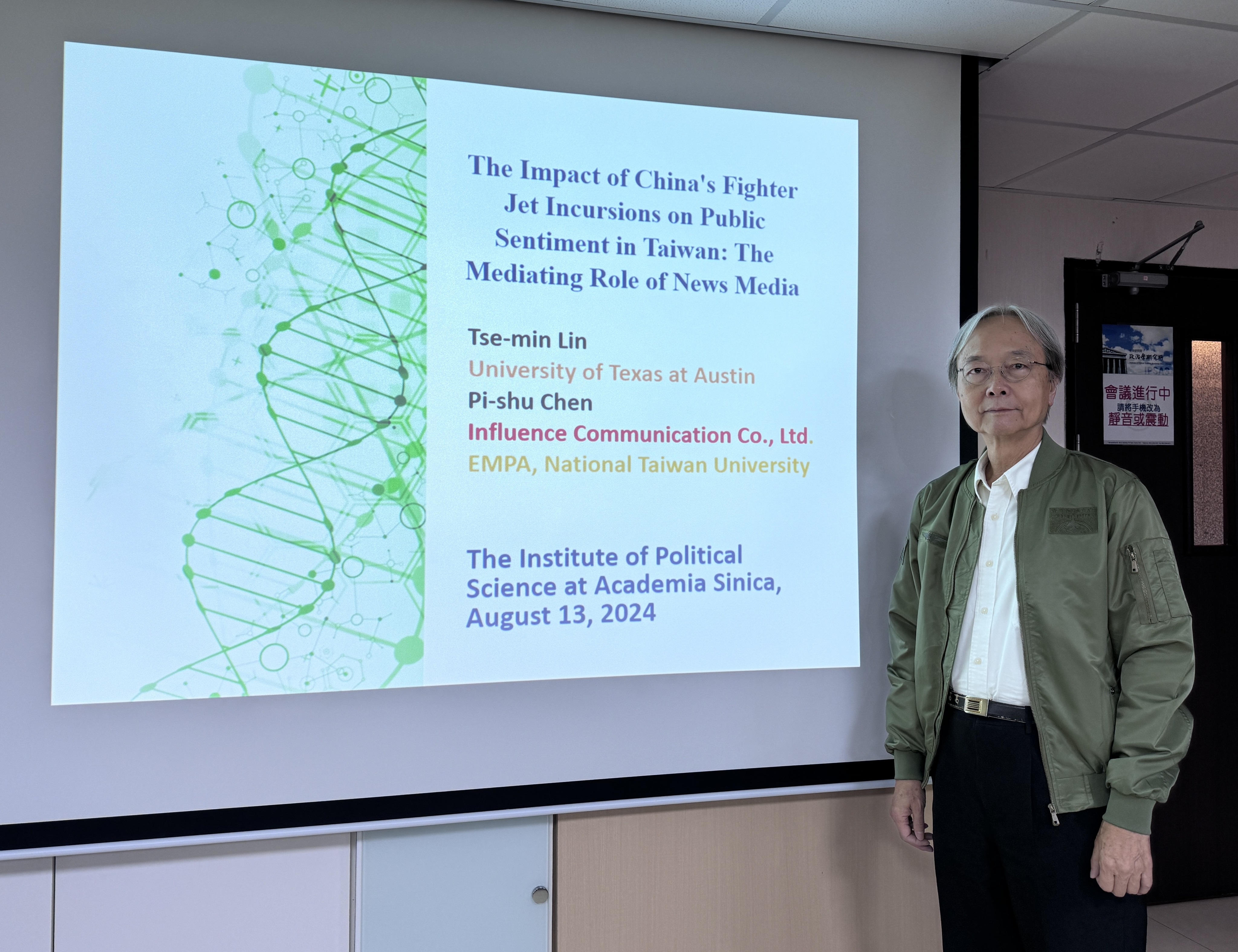 TAIPEI, TAIWAN, August 15, 2024 /EINPresswire.com/ -- On August 13, 2024, at 2:00 PM, the Institute of Political Science at Academia Sinica hosted an academic lecture titled “The Impact of China's Fighter Jet Incursions on Public Sentiment in Taiwan: The Mediating Role of News Media.” The keynote speakers are Professor Tse-min Lin from the Department of Government at the University of Texas at Austin and Ms. Pi-shu Chen, Managing Director of Influence Communication Co. Ltd. This talk will delve into the background, motives, and extensive impact of China's ongoing airspace harassment of Taiwan.Since 2016, China has been sending military aircraft into Taiwan’s Air Defense Identification Zone (ADIZ) regularly, with a notable increase in frequency after U.S. House Speaker Nancy Pelosi's visit in August 2022. In 2023, the number of incursions reached a new peak, with up to 103 aircraft involved in a single day. Professor Lin points out that these high-frequency incursions not only entail significant military expenditure but also result in substantial sunk costs and audience costs, which exert considerable pressure on the Chinese government.