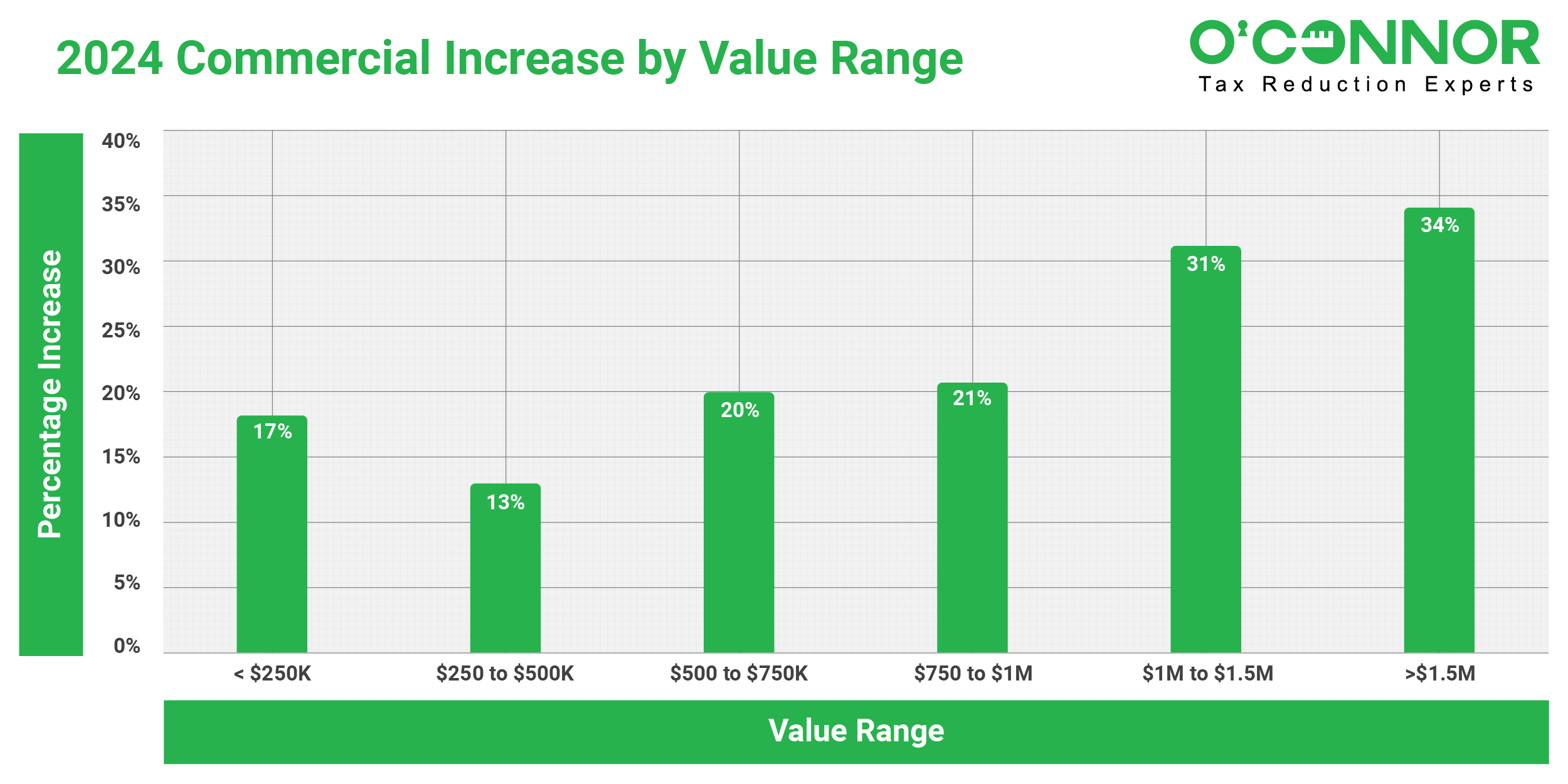 In contrast to homes, commercial property increases appear to have hit the highest valued accounts the hardest. Commercial property worth over $1.5 million in West Chicago Township of Cook County, Illinois was on average assessed at 34% higher in 2024 than in 2023. Owners of commercial properties valued between $250K and $500K witnessed the smallest percent increase of 13%. On average, commercial values rose 32%.