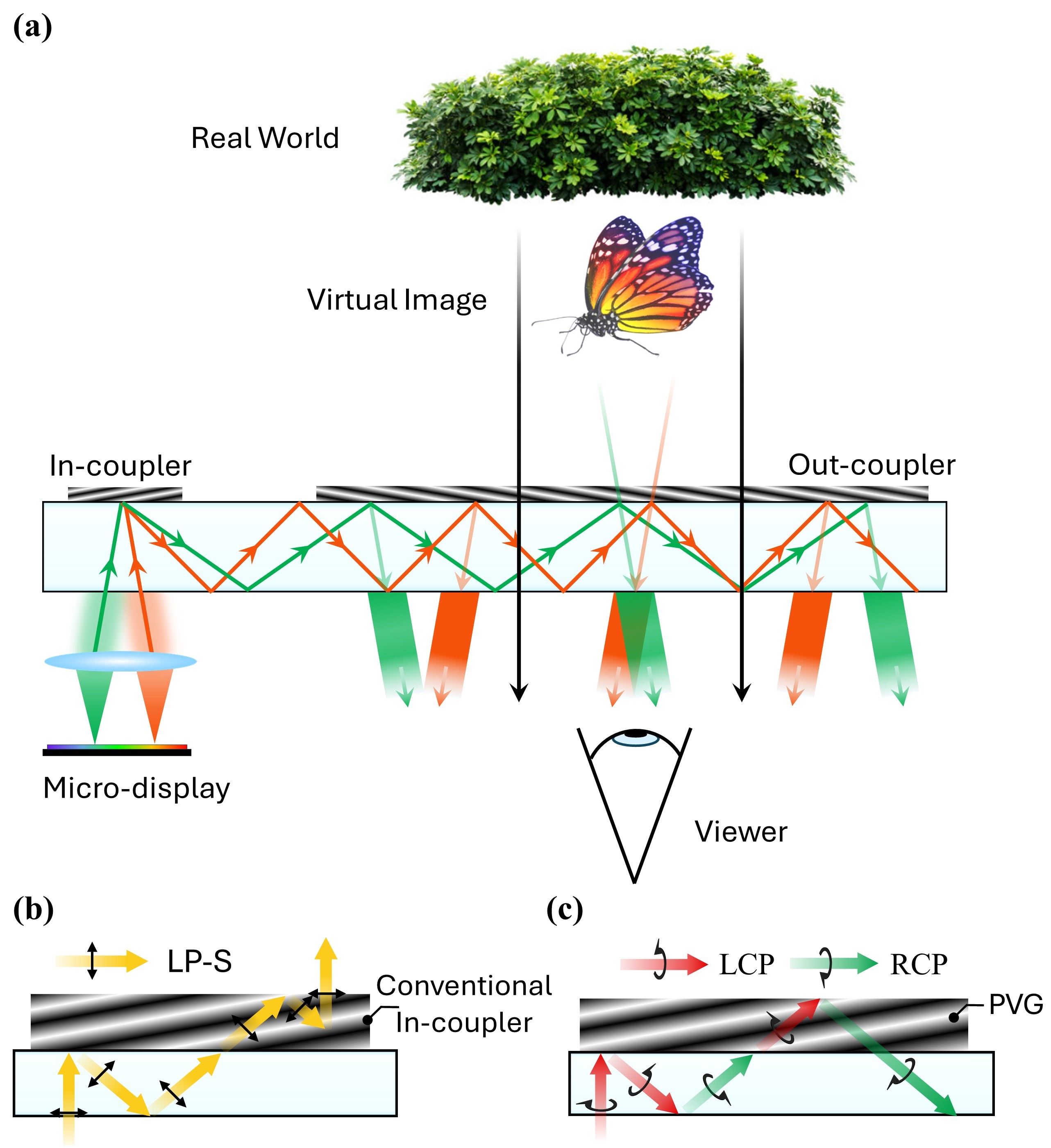 Thanks to these two superior polarization properties, using PVG as an in-coupler in waveguide displays can dramatically enhance in-coupling efficiency and uniformity across the FoV, while maintaining excellent eyebox continuity compared to traditional and metasurface couplers. Specifically, as depicted in Fig. (c), incident LCP light is initially deflected into the waveguide substrate and retains its polarization state due to PVG’s polarization selectivity. After the first interaction and total internal reflection (TIR), the polarization state of light converts to RCP. Upon the second interaction with the PVG, the light undergoes polarization conversion, turning back to LCP if the PVG thickness meets the half-wave condition. Following another TIR, the light becomes RCP and is transmitted through the PVG, enabling it to propagate inside the waveguide while maintaining its direction. Consequently, this process significantly improves in-coupling efficiency and uniformity, while maintaining a desired eyebox continuity.