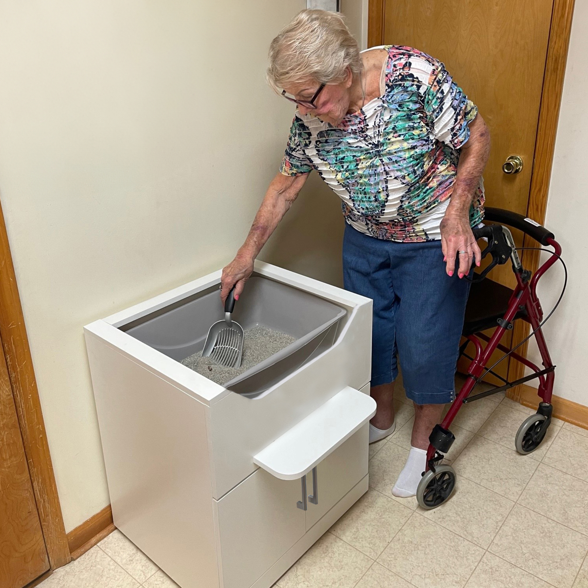 LoftyLoo™ offers the first ADA-accessible litter box, ideal for disabled, aging, and mobility-challenged cat owners. Its ergonomic design allows users to maintain the litter box while sitting or standing, promoting independence and safety. With built-in storage, odor control, and a dog-proof design, LoftyLoo ensures a secure and convenient cat care experience for both pets and their caregivers.