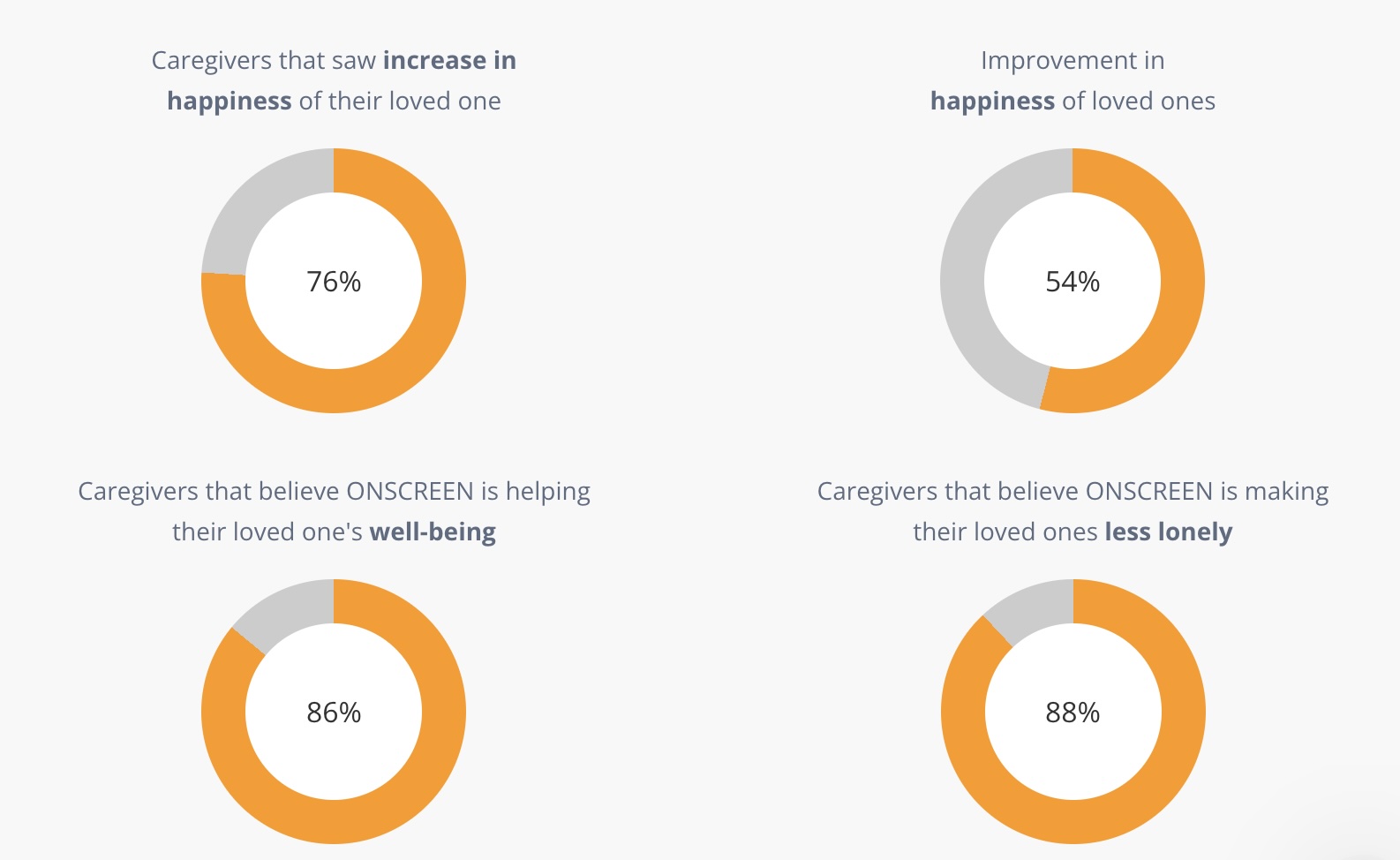 ● 88% of caregivers report a significant reduction in loneliness among seniors using ONSCREEN’s video calling technology.