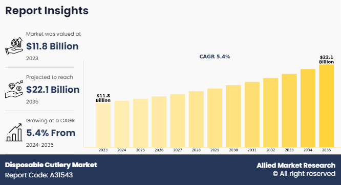 DELAWARE, WILMINGTON, UNITED STATES, September 2, 2024 /EINPresswire.com/ -- According to a new report published by Allied Market Research, titled, “Disposable Cutlery Market," The disposable cutlery market size was valued at $11.8 billion in 2023, and is estimated to reach $22.1 billion by 2035, growing at a CAGR of 5.4% from 2024 to 2035.