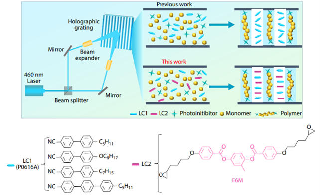 The study's integration of E6M into polymer nanocomposites represents a major advancement. The liquid crystal enhances molecular alignment, achieving a refractive index modulation of 0.050 at 633 nm and maintaining haze at just 5.0% with a 5 wt% concentration. These enhancements lead to a high diffraction efficiency of 96.2% with a minimal thickness of 5 μm, addressing the challenge of balancing optical performance with material thinness. This makes the composites ideal for next-generation AR devices where efficiency and compactness are crucial.