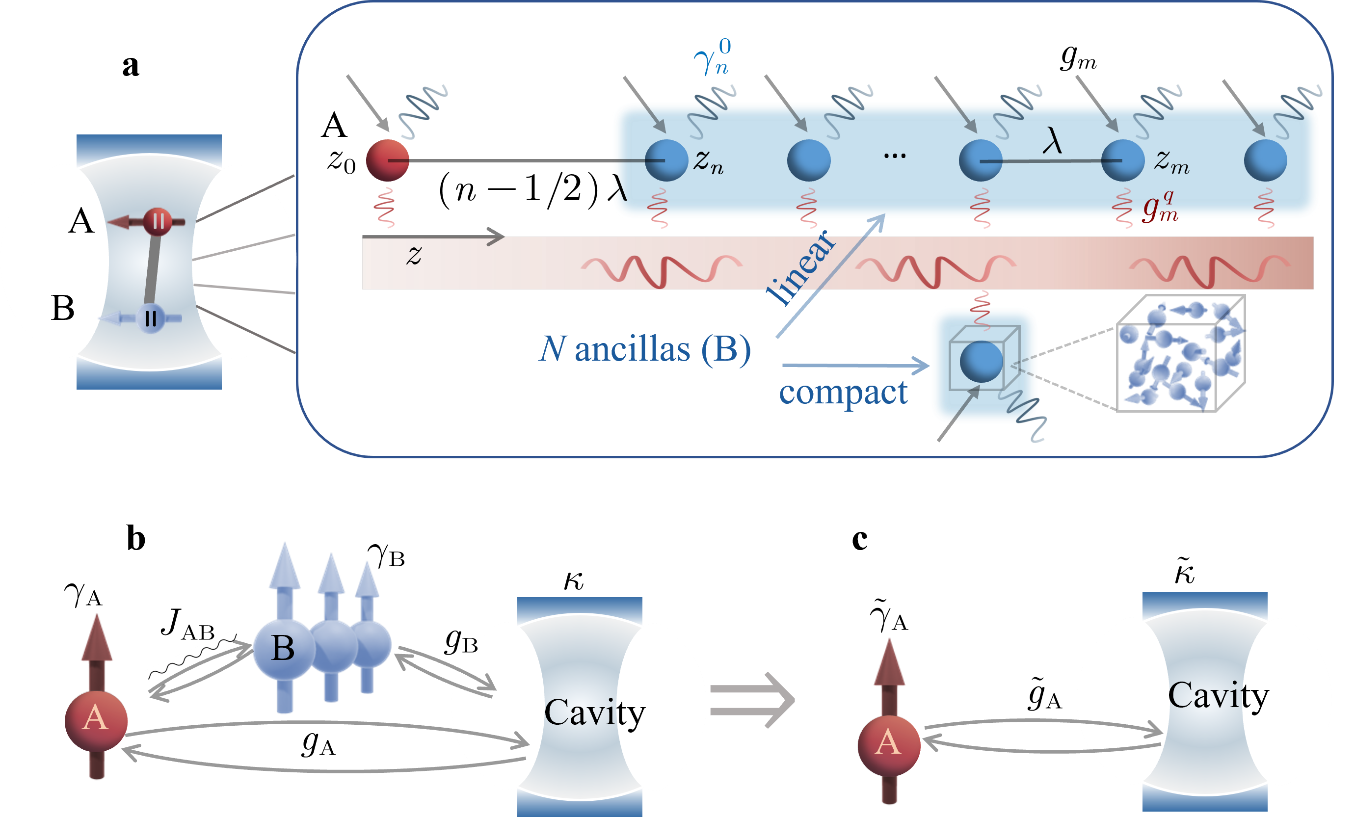“To exploit the collective effect, N ancillary emitters, say B, are placed in the same optical cavity with a SE, say A. Now all emitters are coupled with the cavity. In order to enhance the coupling strength between A and the cavity, all emitters are coupled to a one-dimensional waveguide. Under specific arrangements and coupling strength settings, the energy coupled from the cavity to B will be transferred to A and then coupled to the cavity. Therefore, the presence of B and waveguide provides an additional and indirect coupling channel between A and the optical cavity, which is the connotation of "waveguide assisted energy quantum transfer". In this system, the status of A and B is not equal. The introduction of B is just to improve the interaction cross-section between A and the optical cavity.”