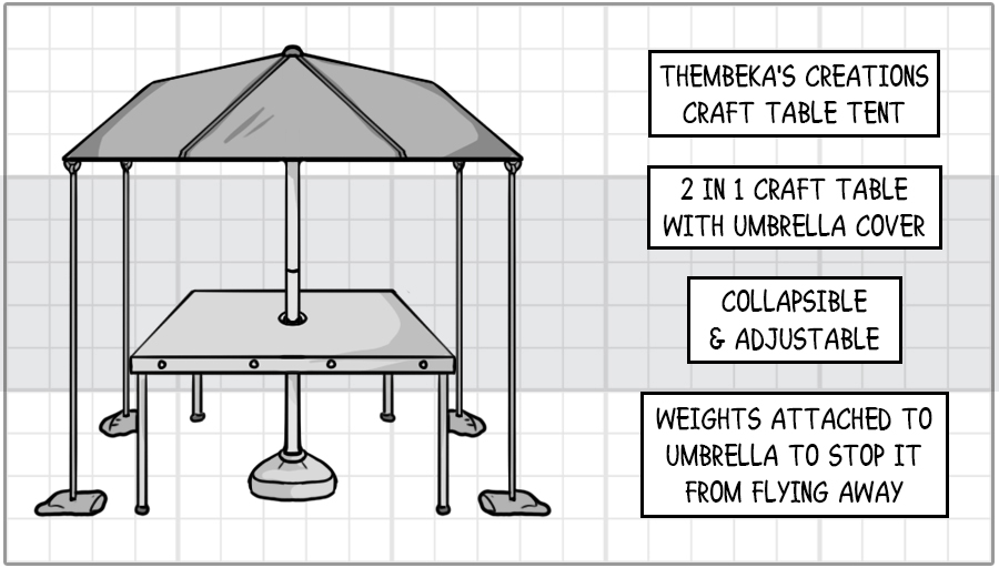 One of the key challenges is ensuring the products can withstand various weather conditions, such as sun, rain, wind, and snow. If tables are left unprotected, items stored on the surface can tip over and even blow away. The Craft Umbrella Table Tent alleviates these issues by utilizing its weighted umbrella features to keep items safe and dry on the table surface. This product would significantly enhance any manufacturer’s product line.