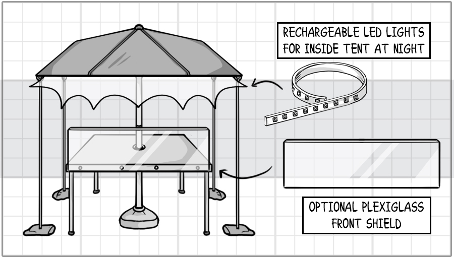 Weights along the legs help keep it stable, preventing it from being knocked over during inclement weather. Other accessories can include rechargeable LED light strips to illuminate the system at night and a Plexiglas shield to protect items stored on the table. While the table is useful at preventing wind and inclement weather from ruining items placed on the table, it remains aesthetically pleasing and can attract customers when selling items using the table.