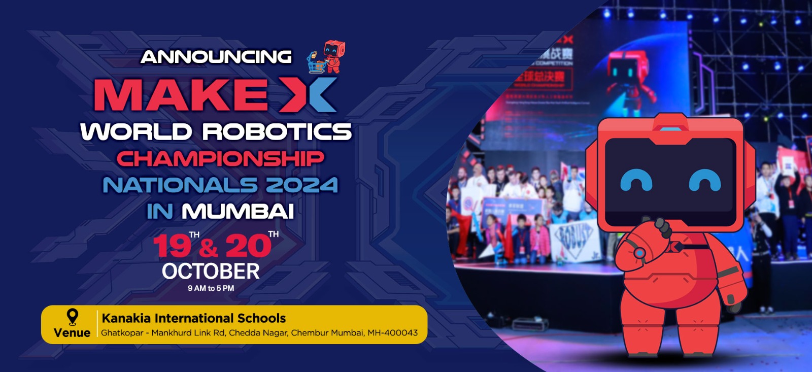 The event will be held at Kanakia International School Auditorium, Ghatkopar-Mankhurd Link Rd, Chedda Nagar, Chembur, Mumbai, MH 400043. A state-of-the-art facility that will accommodate the various activities and competitions planned for the championship. Attendees can expect a vibrant atmosphere with numerous opportunities to engage with the latest advancements in robotics technology.