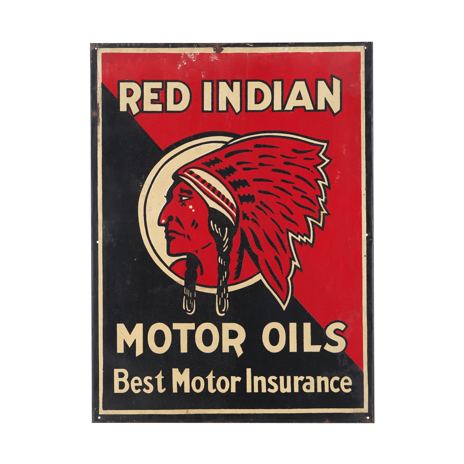 Scarce Red Indian Motor Oil single sided tin sign featuring the earlier and more detailed “Indian Head” logo and the slogan: “Best Motor Insurance”, 23 ¼ inches by 17 ¼ inches (CA$64,900).